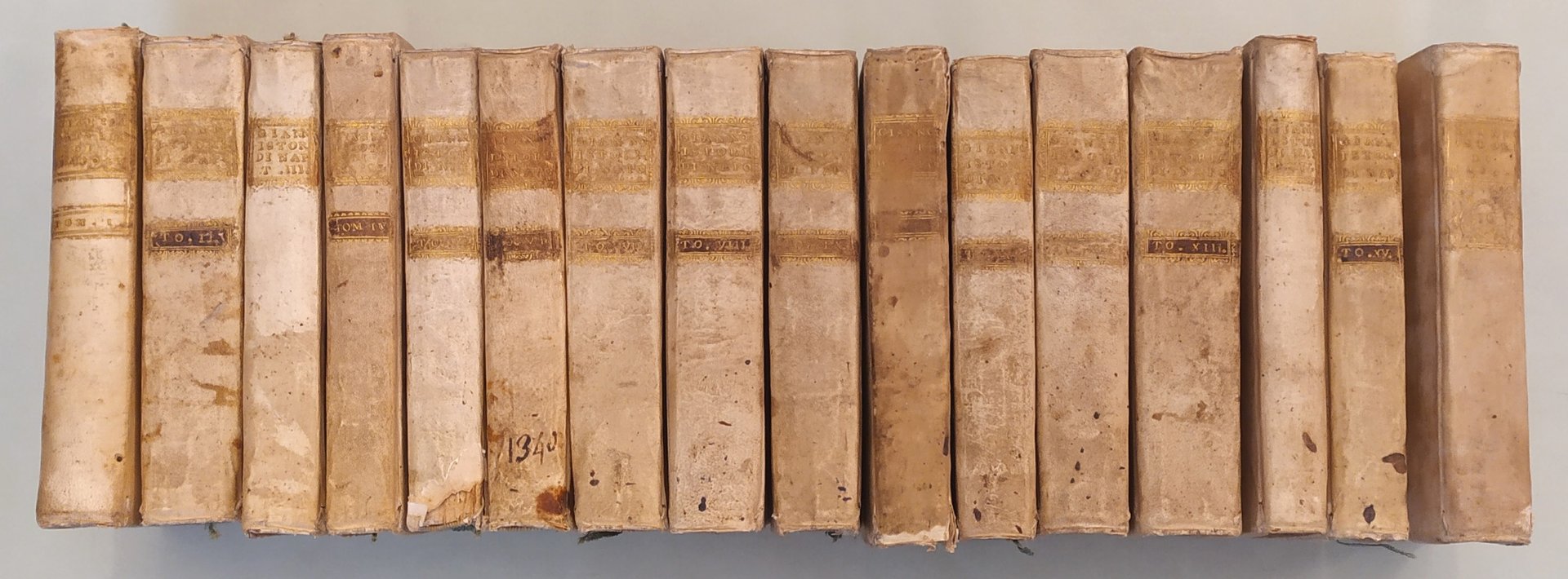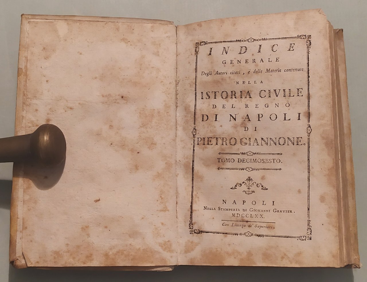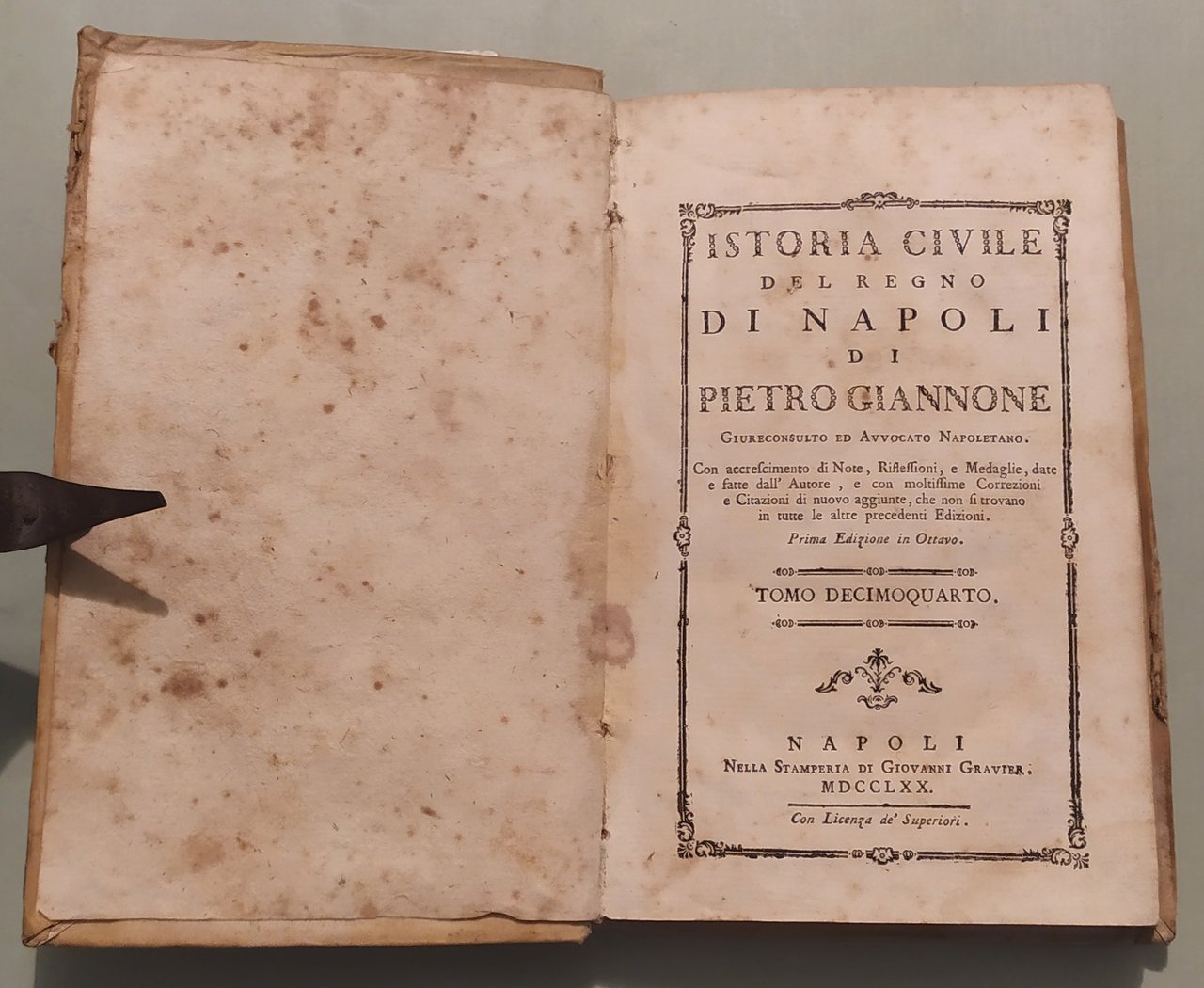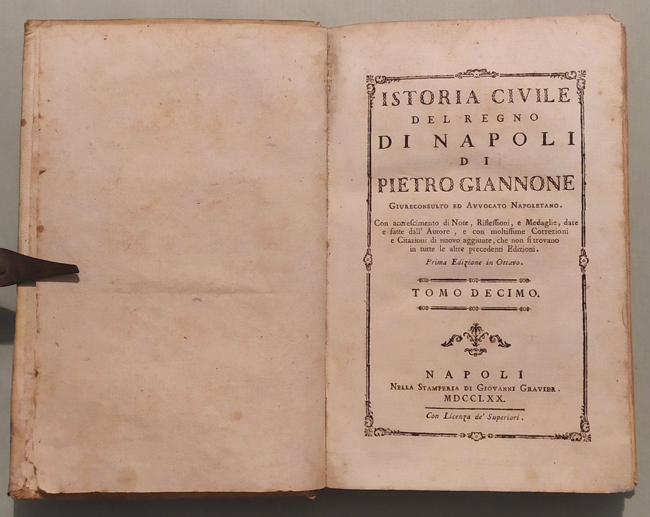 Napoli, nella Stamperia di Giovanni Gravier, 1770. Sedici volumi in 8vo (cm.19x13); pp.8n.nn., XXXXVII,392; 8n.nn.,407; 8n.nn.,330; 291; 362; 348; 8n.nn,419; 8n.nn.,396; 8n.nn.,415; 8n.nn.,360; 8n.nn.,368; 8n.nn.,430; 8n.nn.,510; 8n.nn.,310; 8n.nn.,328; 378. Al volume primo tavola spieghevole con ritratto in ovale dell’autore, strappo al margine inferiore. Una tavola con monete al vol. II pag.50. Legatura coeva in pergamena, titolo e fregi in oro ai dorsi. Brunit. Pironti, Editori Francesi in Napoli, pag.148. Treccani.it: “Giannone Pietro. Storico e scrittore politico (Ischitella 1676-Torino 1748); gli studî giuridici, e le dispute che divampavano nel Regno di Napoli, accentrarono gli interessi di G. sul problema dei rapporti fra Stato e Chiesa, che costituiscono il filo conduttore della sua Istoria civile del Regno di Napoli, narrazione delle vicende politiche, giuridiche, culturali e religiose dell'Italia meridionale dalle origini del cristianesimo alla fine del sec. 17º.”