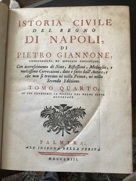 Istoria civile del Regno di Napoli. Di Pietro Giannone giureconsulto ed avvocato napoletano. Con accrescimento di Note, Riflessioni, Medaglie e con moltissime Correzioni, date e fatte dall'Autore, e che non si trovano né nella Prima né nella Seconda Edizione. Tomo I. Tomo II, Tomo III e Tomo IV.