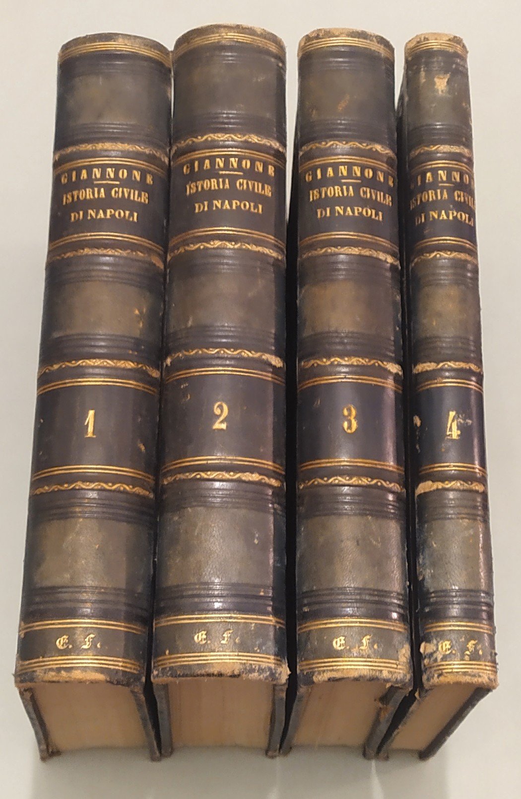 Prato, Giacchetti, 1864-1865. Quattro volumi in 8vo; pp.813; 782; 648; 410. Al quarto volume: Apologia della storia civile del Regno di Napoli di Pietro Giannone. Una tavola con monete al volume II. Mezza pelle coeva, doppio tassello ai dorsi con titolo e fregi in oro.