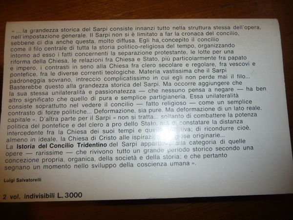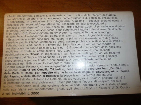 DESCRIZIONE: Sansoni Editore Firenze 1966 I^ Ed. 2 voll. br. ed. Vol. I: pp. XXXIV, 475, (1); Vol. II: da p. (6), 581 a p. 1086 in 8°. Teologo, astronomo, matematico, fisico, anatomista, letterato e polemista, fu tanto versato in molteplici campi dello scibile umano da essere definito da Girolamo Fabrici d'Acquapendente «Oracolo del secolo». Autore della celebre Istoria del Concilio tridentino, subito messa all'Indice, fu fermo oppositore del centralismo monarchico della Chiesa cattolica, difendendo le prerogative della Repubblica veneziana, colpita dall'interdetto fulminato da Paolo V. Rifiutò di presentarsi di fronte all'Inquisizione romana che intendeva processarlo e subì un grave attentato che si sospettò essere stato organizzato dalla Curia romana, "agnosco stilum Curiae romanae", che negò tuttavia ogni responsabilità. CONDIZIONI: Buone. Questo libro proviene da una importante biblioteca privata, per cui alla prima bianca sono riportati i codici di catalogazione oltre a quelli sul dorso. MANCANTE DEL COFANETTO. PESO / WEIGHT: 1151 gr. without package