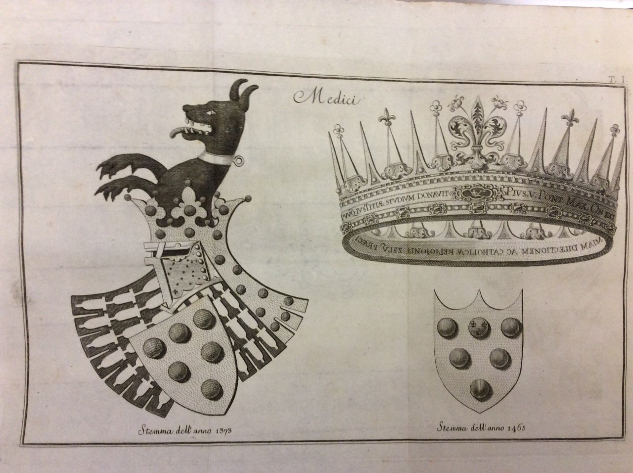 In-8 gr. (mm. 267x197), 5 volumi, mz. pelle coeva con ang., filetti e titolo oro su tassello al dorso, pp. (6),lV,398; (4),480; (4),514; (4),411; (4),370; ben illustrati da: 8 tavole inc. in rame, ciasc. con un medaglione dei Granduchi (recto e verso) + 5 grandi tavole ripieg., delle quali 4 per l'albero genealogico e 1 per gli stemmi di Casa Medici.Storia del regno della famiglia Medici, da Cosimo I (1537) a Giovan Gastone (1737), preceduta da un quadro delle vicende della Toscana e soprattutto di Firenze, prima dell'ascesa dei Medici. L'opera e' dedicata al Granduca di Toscana Pietro Leopoldo che l'aveva commissionata. "Prima edizione".Cfr. Lozzi,II,5464 - Gamba,2592: Riputata istoria - Moreni,I,409 - Brunet,II,1469 che cita le varie ediz. e la traduz. in francese di questa "ouvrage intéressant".Con lievissime fioriture intercalate nel testo; la p. 291 (di indice nel vol. V) con alone e piccola mancanza marginale, altrimenti esemplare su carta distinta, ben conservato.