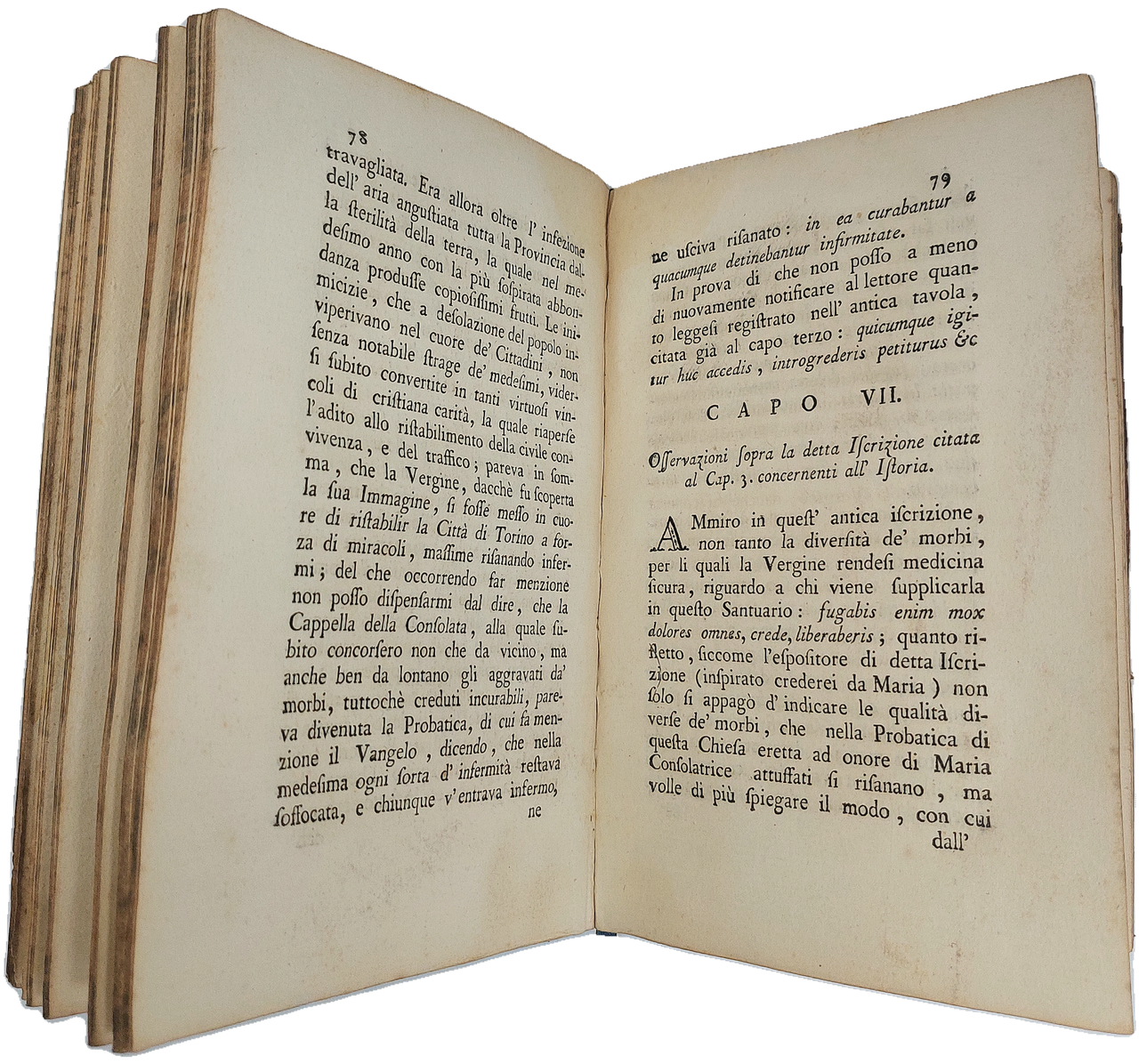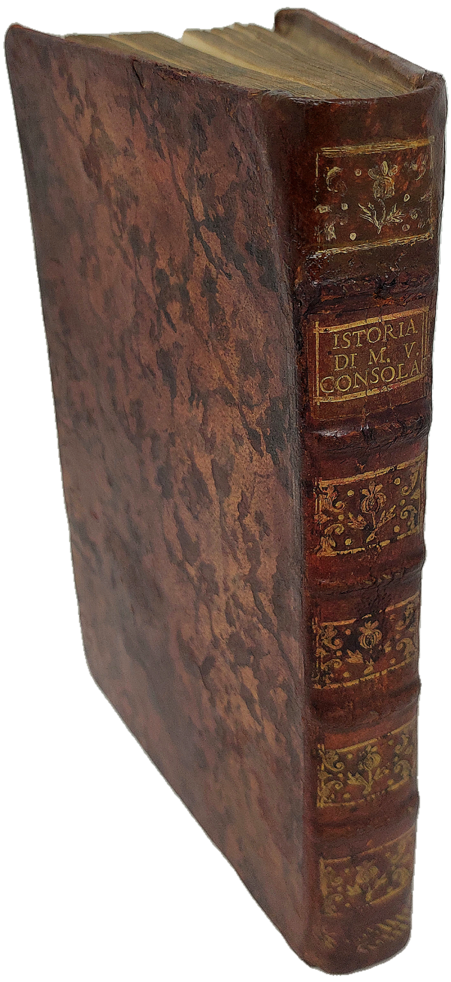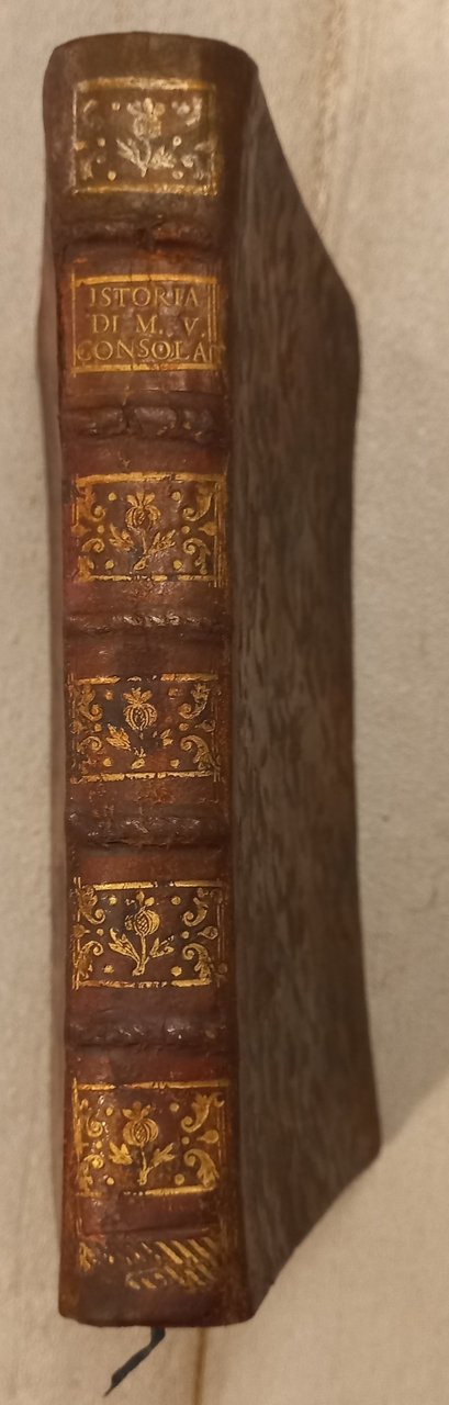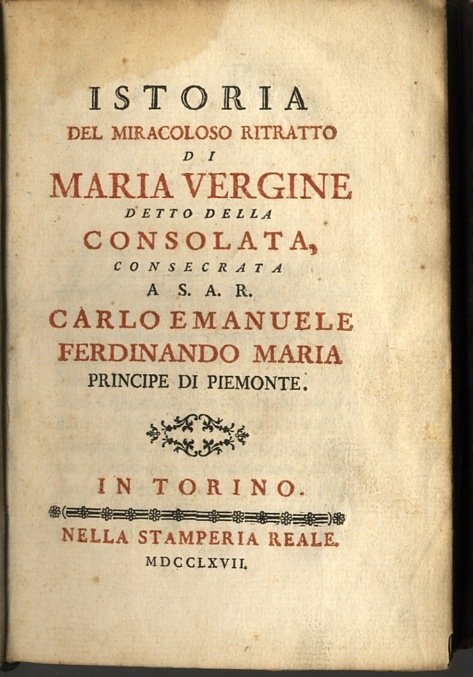 >In-8, pp. 214, (2) frontespizio in rosso e nero. Legatura coeva in piena pelle, dorso a nervi, fregi e titolo oro al dorso (abile restauro a uno dei quadranti del dorso). Opera scritta dai monaci cistercensi custodi della sacra immagine della Consolata, da sempre venerata a Torino. Ottimo stato di conservazione, piuttosto raro. Manca al Lozzi e a Manno.