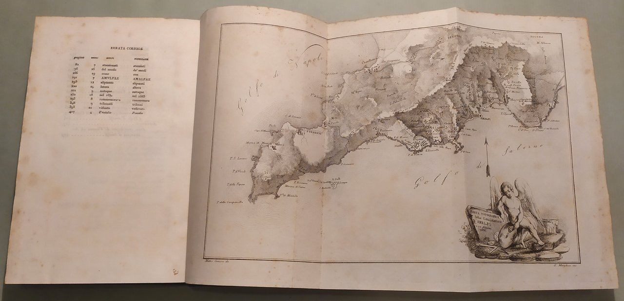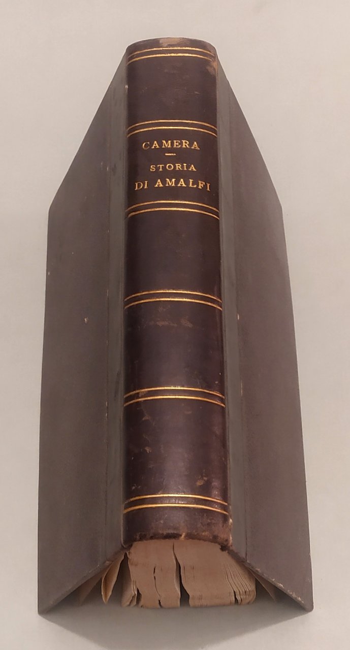 Napoli, dalla Stamperia e Cartiera del Fibreno, 1836. In 8vo; pp.457, 1n.n. con errata. Stemma della città al frontespizio. 12 tavole intercalate nel testo. In fine tavola spieghevole con la pianta topografica della città e costiera d'Amalfi e sue adiacenze da Punta della Campanella a Capo d’Orso. Mezza pelle coeva. Titolo e fregi dorati al dorso. La descrizionei delle principali località della costiera: Ravello, Atrani, Conca, Agerola, Praiano, Vettica e Positano. Lozzi, 45.