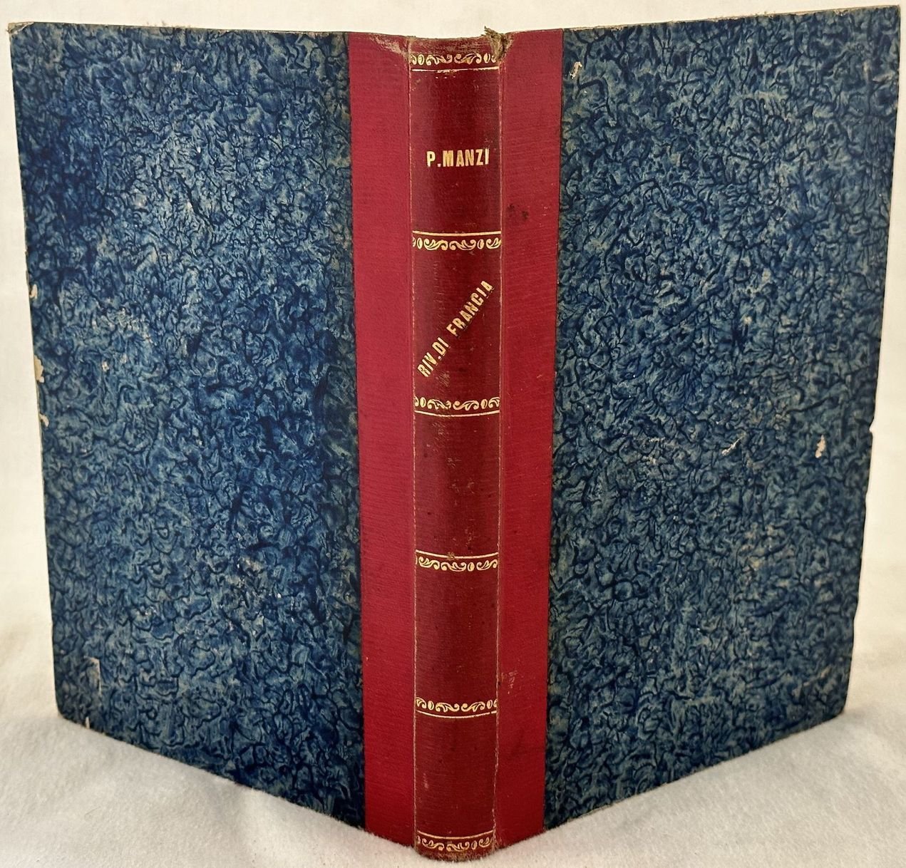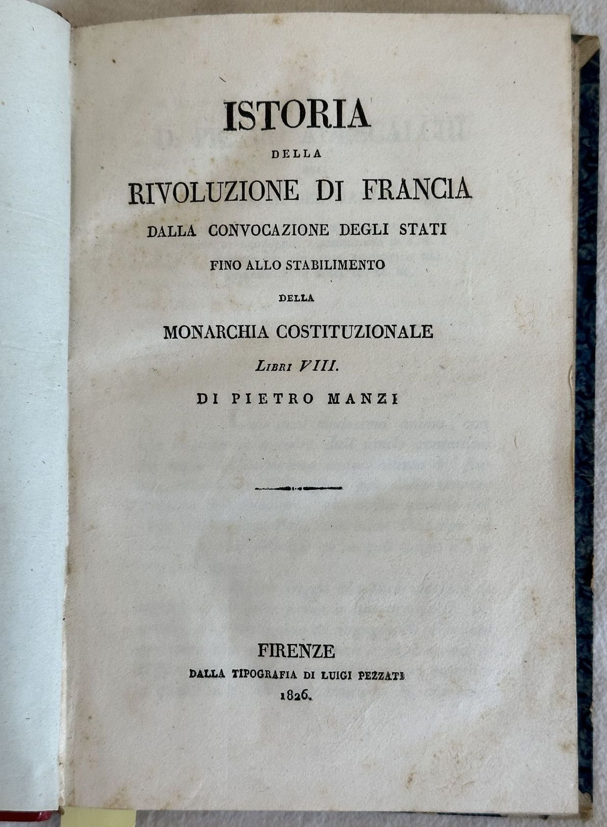 Interessante opera del 1826 sulla Rivoluzione francese scritta dall'archeologo ed erudito laziale Pietro Manzi (Civitavecchia 1785-1839). In buone condizioni. Copertina in mezza pelle ottocentesca con titolo e decorazioni in oro al dorso in buone condizioni generali con lievi usure ai margini e dorso. Legatura in buone condizioni. Pagine in buone condizioni con fioriture. In 8. Dim. 21,5x15 cm. Pp. 226. Peso Kg. 0,350Interesting work of 1826 about the French Revolution written by the archeologist and scholar from Lazio Pietro Manzi (Civitavecchia 1785-1839). In good conditions. Half leather cover of 19th century with gilted title and decorations in the spine in good general conditions lightly worn in the extremities. Binding in good conditions. Inside pages are in good conditions with foxing.In 8. Dim. 21,5x15 cm. Pp. 226. Weight Kg. 0,350