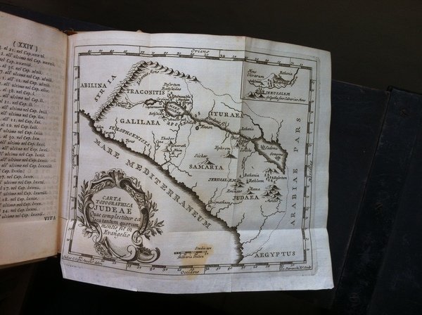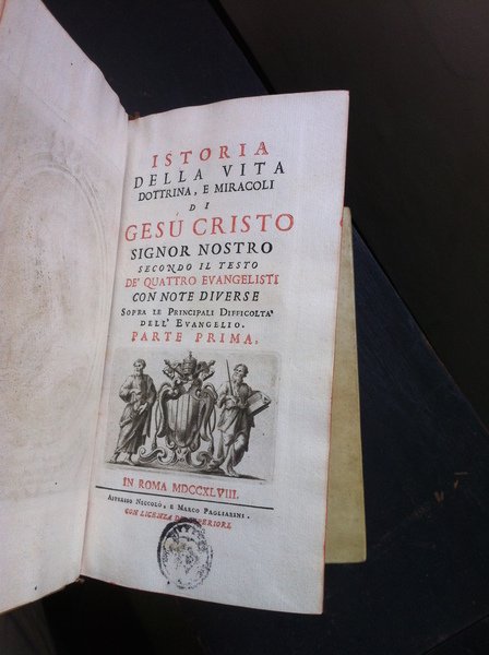in-8°. 2 voll. vignette incise su rame al frontespizio incisi a rame, capilettera figurati incisi su rame. legatura in piena pergamena coeva con titolo manoscritto al dorso e tagli in rosso. primo vol: pp. (22) 482. Carta geografica della Terra Santa ripiegata, antiporta con ritratto del Cristo incisa a rame. Un piccolo numero di pagine presenta una tarlatura marginale. secondo vol: pp. (2) 480. Opera dedicata a papa Benedetto XIV.