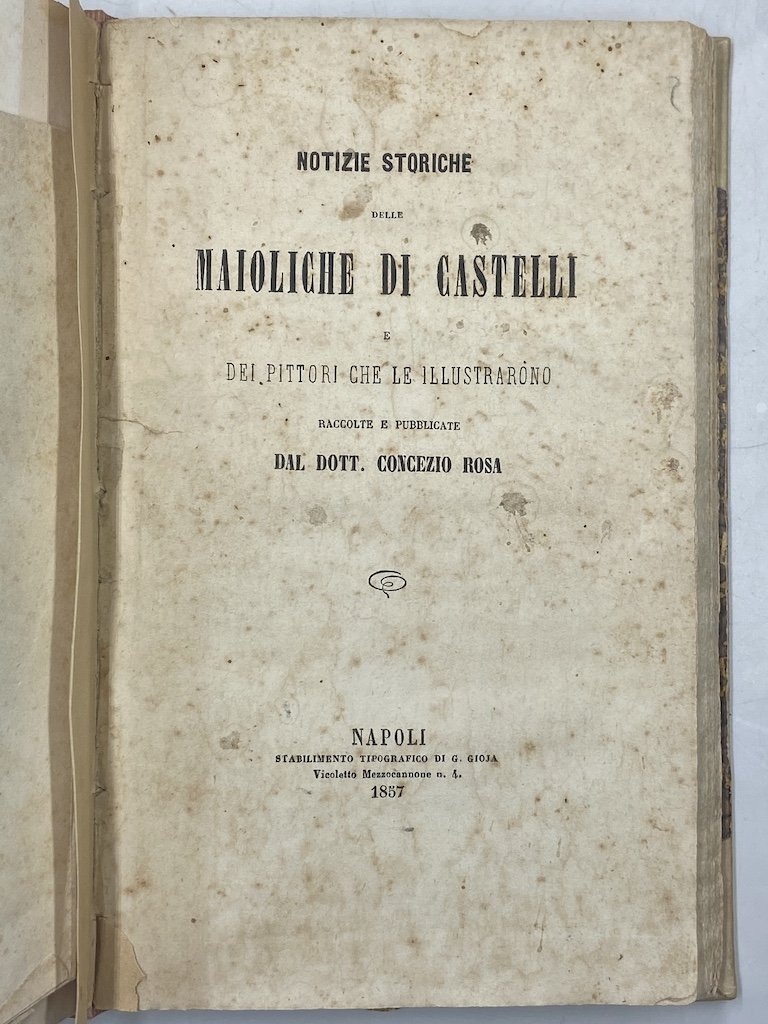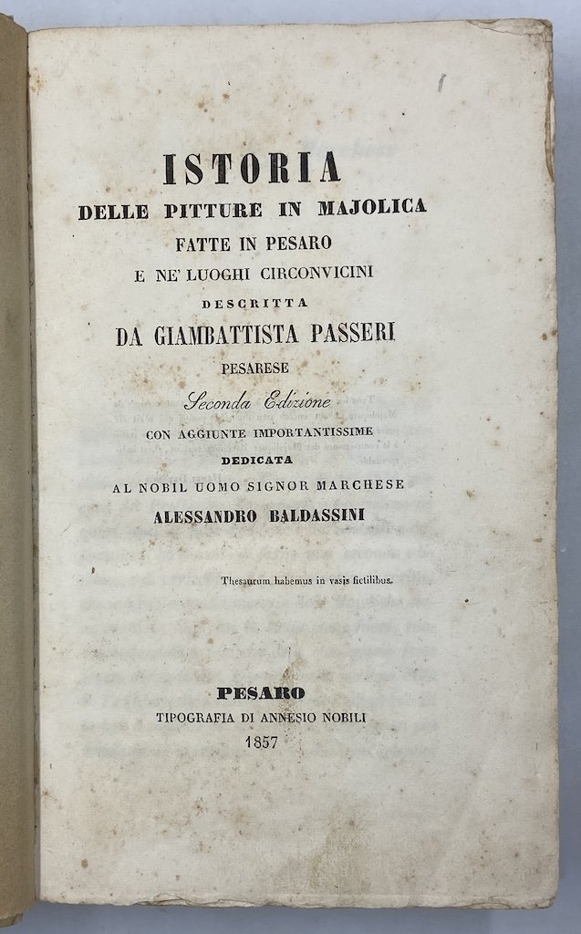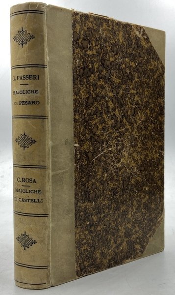 ISTORIA DELLE PITTURE IN MAJOLICA FATTE IN PESARO E NE’ LUOGHI CIRCONVICINI DESCRITTA DA GIAMBATTISTA PASSERI PESARESE. SECONDA EDIZIONE CON AGGIUNTE IMPORTANTISSIME DEDICATA AL NOBIL UOMO SIGNOR MARCHESE ALESSANDRO BALDASSINI. PESARO TIPOGRAFIA DI ANNEJO NOBILI 1857 [legato con] Rosa, Concezio (Castelli 1824 - Corropoli 1876) NOTIZIE STORICHE DELLE MAIOLICHE DI CASTELLI E DEI PITTORI CHE LE ILLUSTRARONO RACCOLTE E PUBBLICATE DAL DOTT. CONCEZIO ROSA. NAPOLI, STABILIMENTO TIPOGRAFICO DI G. GIOJA 1857.