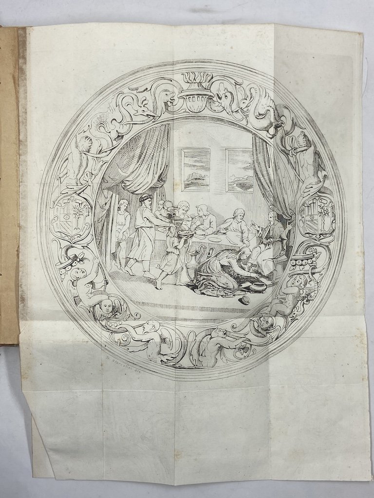 Due opere legate insieme, solida mezza pergamena d’inizio Novecento con titoli sul dorso. Prima opera: pp XX 215 (1), tre tavole ripiegate in fine e una a piena pagina nel testo.Seconda opera: pp 140 più una carta di errata in fine, una tabella ripiegata. Sparse fioriture, complessivamente ben conservata l’opera di Passeri, quella di Rosa mancante dell’occhietto, con frontespizio un poco brunito e con antica menda sul margine delle prime due carte. ********* Prima opera: ISTORIA DELLE PITTURE IN MAJOLICA FATTE IN PESARO E NE’ LUOGHI CIRCONVICINI DESCRITTA DA GIAMBATTISTA PASSERI PESARESE. (SECONDA EDIZIONE, 1857)- Prolifico autore di numerose opere di carattere filologico e archeologico, G.B. Passeri fu uno dei maggiori esponenti dell’etruscheria che travolse la cultura italiana nel Settecento; la prefazione di Giuseppe Ignazio Montanari all’opera qui proposta attribuisce all’autore il merito di esser stato “il primo a interpretare i caratteri, la pittura, le sculture, i vasi, le gemme, le medaglie ed ogni altro monumento etrusco”. L’opera fu stampata la prima volta a Venezia nel 1748, quindi nel XIX secolo a Bologna e Pesaro (1838), questa seconda edizione pesarese è arricchita di brevi scritti sulla maiolica urbinate (di P. Pungileoni) e su Mastro Giorgio da Gubbio (del Marchese Ranghiasci-Brancaleoni), di una appendice di E. Delange apparsa per l’edizione francese, e di lettere su raccolte di ceramiche di G. I. Montanari e Domenico Mazza. ********** Seconda opera: NOTIZIE STORICHE DELLE MAIOLICHE DI CASTELLI E DEI PITTORI CHE LE ILLUSTRARONO RACCOLTE E PUBBLICATE DAL DOTT. CONCEZIO ROSA. (1857). Precursore della paleontologia in Italia e autore di scavi e ricerche sugli insediamenti neolitici in Abruzzo e in particolare in Val Vibrata, il medico condotto C. Rosa fu anche l’autore di questa prima monografia sulle ceramiche di Castelli, con documenti e biografie dei Grue e gli altri artisti castellani.
