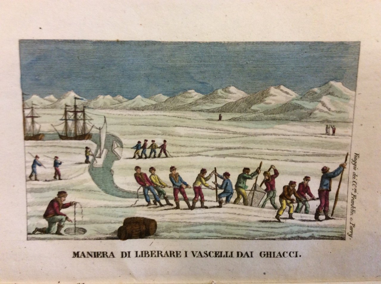 In-16 gr. (mm. 197x115), mz. pelle coeva con ang., fregi e titolo oro al dorso, conserv. brossura orig., pp. XI,295, con 1 bella tav. inc. in rame e colorata a mano (+ suite in bianco e nero) che raffigura la maniera di liberare i vascelli dai ghiacci e 1 carta geografica delle regioni polari artiche, pure inc. in rame e più volte ripieg. Il volume è diviso in due parti: nella prima viaggio del capitano Franklin sopra le coste settentrionali dell'America (nel tentativo di scoprire il Passaggio di Nord-Ovest, morendo in tale impresa con tutti gli uomini della spedizione). Nella seconda viaggio del capitano Parry negli anni 1821, 1822 e 1823 (anch'egli alla ricerca del Passaggio). Prima versione italiana, di Giuseppe Rossi, nell'ambito della Raccolta de' viaggi.. nelle varie parti del mondo, tanto per terra quanto per mare, dopo quelli del celebre Cook, e non pubblicati finora in lingua italiana. Fioriture e/o arrossature intercalate nel testo, altrimenti esemplare con barbe, ben conservato.