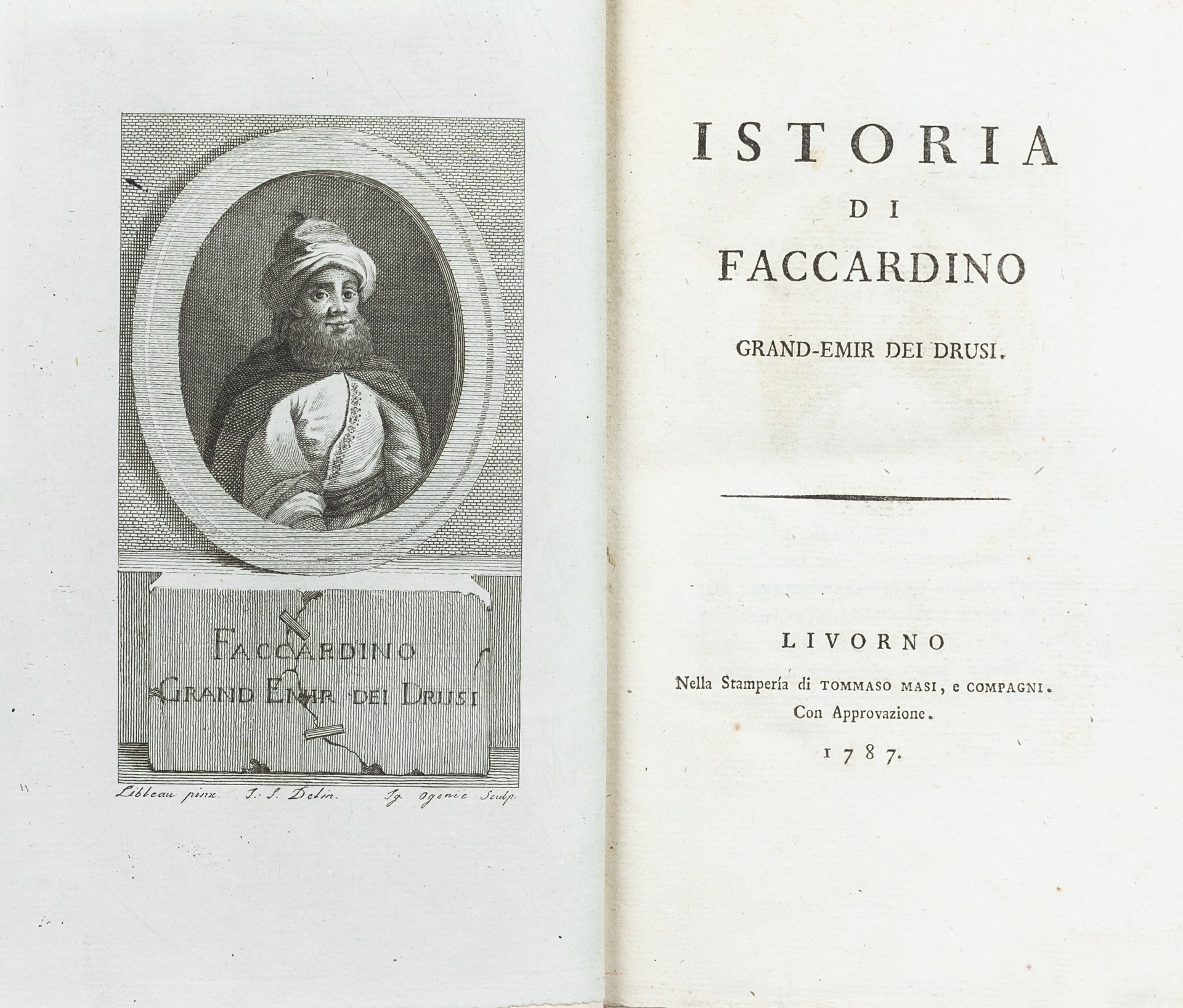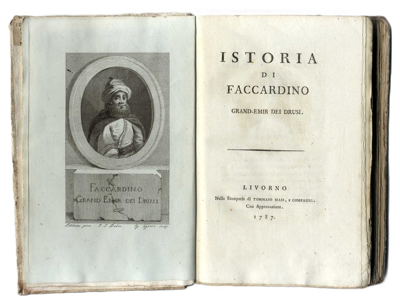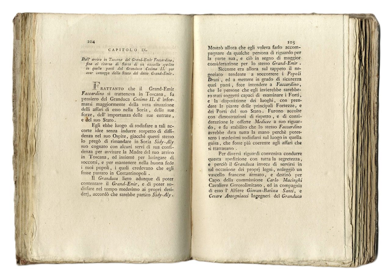 Edizione originale dedicata a Vincenzo Paternò Castello principe di Biscari, di questo interessante e non comune resoconto delle gesta di Fakhr al-Din II, emiro druso del Libano dal 1608 al 1635, che guidò una ribellione contro l'autorità ottomana in alleanza con il Granducato di Toscana. Fakhr ad-Din II, principe libanese in esilio forzato dal proprio regno, è ospite nel 1613 di Cosimo II nel Granducato di Toscana, dove il suo nome viene italianizzato in Faccardino, divenne poi celebre per i grandi giardini e le sontuose opere pubbliche con cui aveva abbellito il Libano, ispirandosi alle bellezze dei monumenti fiorentini e romani che potè ammirare durante il suo soggiorno in Italia.