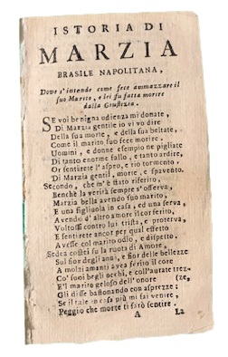 In 12°; (12) pp. Senza brossura, in buone condizioni di conservazione. Rara placchetta popolare stampata a Lucca da Marescandoli che narra le vicende della donna napoletana Marzia Brasile che assassinò il marito e finì per essere giustizia per decapitazione. Molto raro, nessun esemplare censito in ICCU.