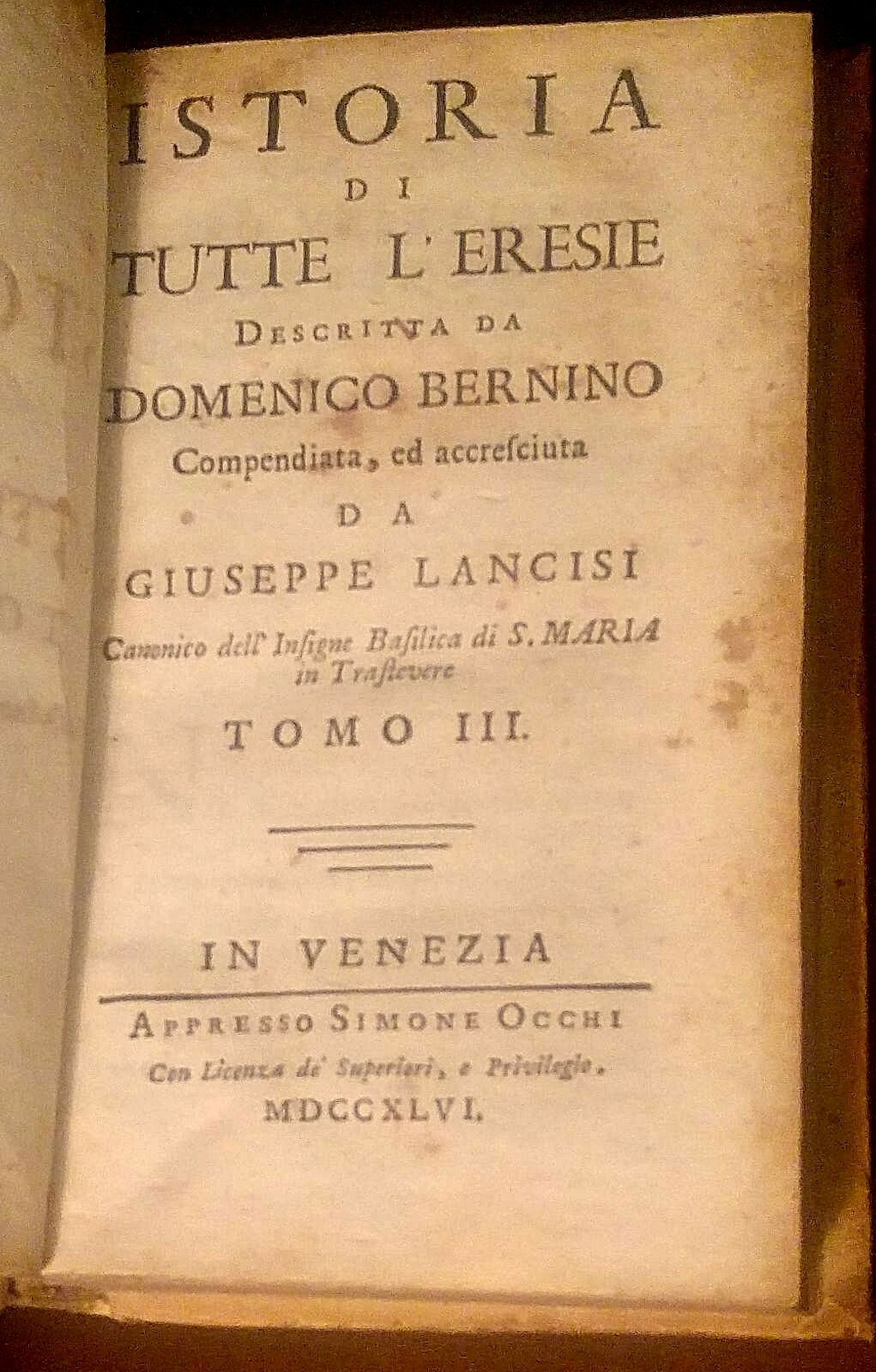 ISTORIA DI TUTTE LE ERESIE TOMO 3 999 1404 di Domenico Bernino 1746 libro antico