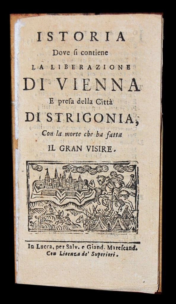 In 12° (15×7,2 cm); (12) pp. Brossura marmorizzata ottocentesca. Allinterno esemplare in buone-ottime condizioni di conservazione. Bellissima scena xilografica al frontespizio con veduta dellAssedio di Vienna da parte dei turchi. Rarissima placchetta che racconta la storia dellAssedio di Vienna da parte delle armate turche nel 1683 e la successiva liberazione della città grazie allarrivo della celebre Cavalleria alata polacca, guidata dal re di Polonia, Jan III° Sobieski. Lopera segue poi a descrivere gli avvenimenti seguiti alla rottura dellassedio con larmata turca in fuga e quella polacca e cristiana unificata che la insegue. Le operazioni belliche proseguirono fino a raggiungere Budapest dove il Gran Visir, venne fatto giustiziare per ordine dello stesso capo militare turco e la città abbandonata alle truppe cristiana. Rarissimo resoconto di una delle battaglie più famose della storia delloccidente che sancì definitivamente, lespansione dellImpero Ottomano verso lEuropa. La battaglia rimase celebre per il ruolo salvifico avuto dalla Cavalleria Polacca alata (le truppe polacche portavano sulle spalle delle ali con piume di aquila che durante la carica producevano un rumore impressionante) che piombò sullimpreparato accampamento ottomano che nel caos più totale fu costretto ad una ritirata veloce e disordinata. Rarissimo. Very rare.