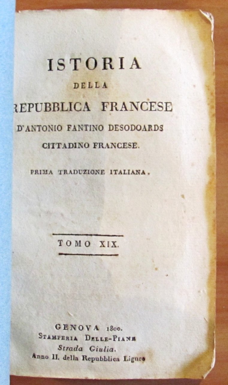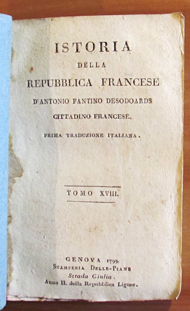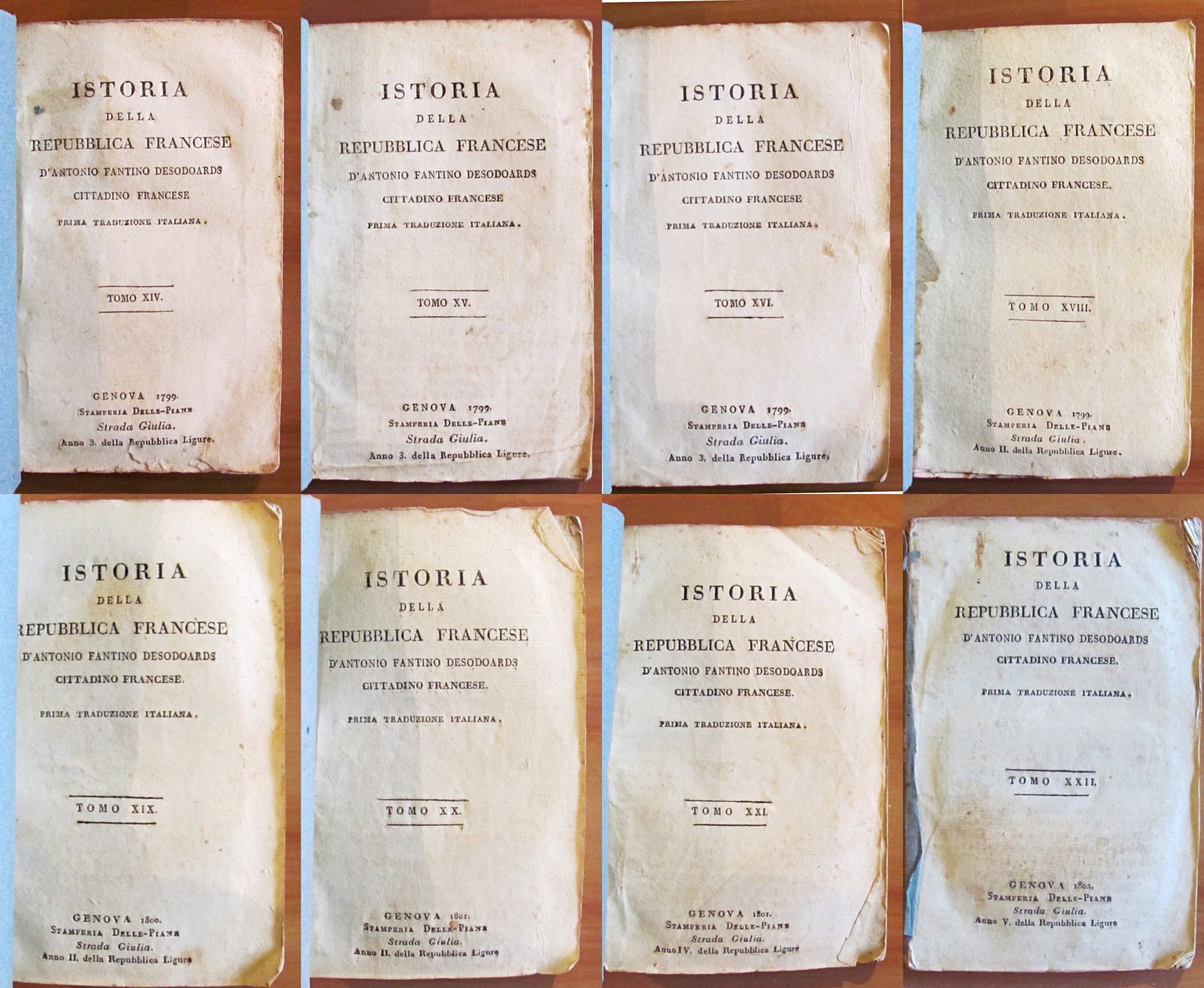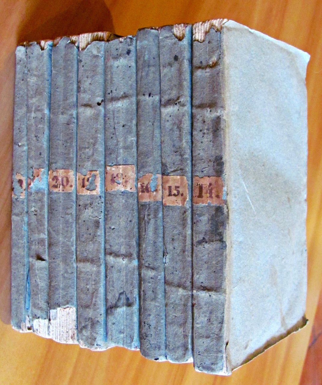 Prima traduzione italiana. Tomi XIV - XV - XVI - XVIII - XIX - XX - XXI - XXII. Stamperia Delle-Piane, Genova - 1799/1802. Anni 2/5 della Repubblica Ligure. Cartoncini coevi muti. Mancanze e imperfezioni ai dorsi dei Tomi XIV, XV, XIX, XX, XXI, XXII. Vecchi timbri e segni a penna alla copertina del Tomo XX. Totale mancanza del piatto del tomo XXII. 11,5x17,5; pp.177 + 160 + 144 + 190 + 190 + 192 + 156 + 127. RARI. BUONISSIMO STATO , Molto buono (Very Good)