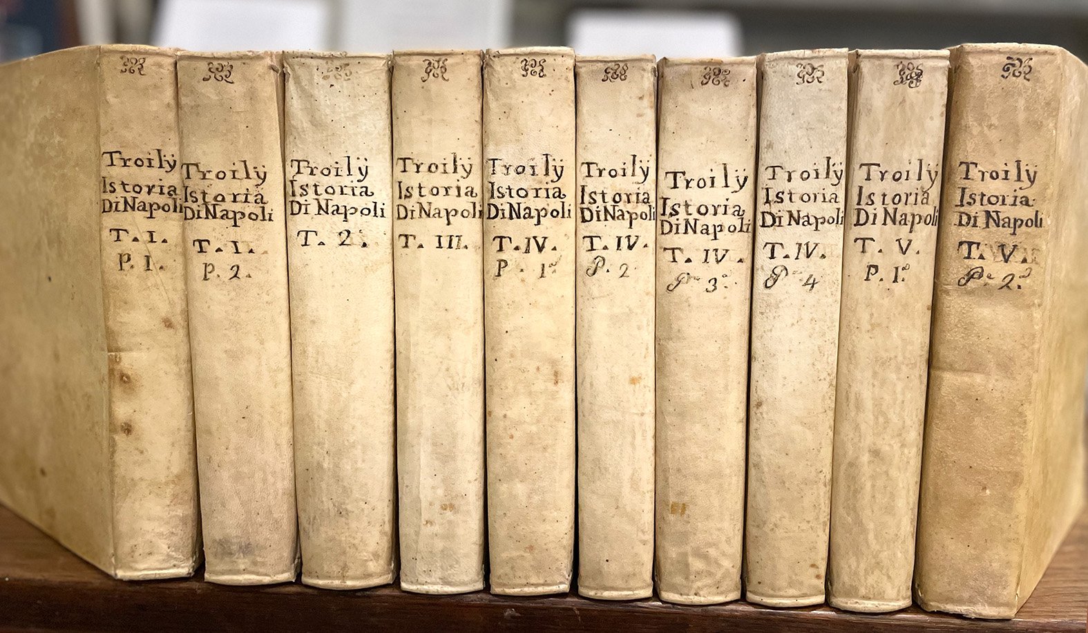 (Reame di Napoli-Opera monumentale) TROYLI Placido. Istoria generale del Reame di Napoli. Ovvero Stato antico e moderno delle Regioni, e Luoghi che il Reame di Napoli compongono, una colle loro prime Popolazioni, Costumi, Leggi, Polizia, Uomini illustri, e Monarchi. Napoli, 1747-1753. In-4° (19x24), Cinque tomi in Dieci grossi volumi, bella legatura coeva in piena pergamena con titoli calligr. al dorso; oltr 6.000 pagine complessive. Magnifico esemplare di questa rarissima opera.