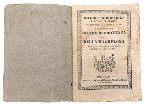 14x9,7 cm; 48 pp. Brossura mura coeva. Un leggero alone ma per il resto, esemplare in buone condizioni di conservazione. Titolo impresso in nero al frontespizio, entro cornice xilografica. L'opera ripercorre la storia di uno dei romanzi francesi più noti del quattrocento, "Pierre de Provence et la belle Maguelonne" che a sua volta, sembra che prendesse ispirazione dal motivo fondamentale da "l'Escoufle e con Guillaume d'Angleterre", opera che si ritiene opera di Chrétien de Troyes. Il suo autore, anonimo, si crede comunque che seppur di lingua francese, conoscesse Napoli date le citazioni di interesse napoletano che si trovano nell'opera. Il figlio di Magalona, infatti, diverrà re di Napoli.