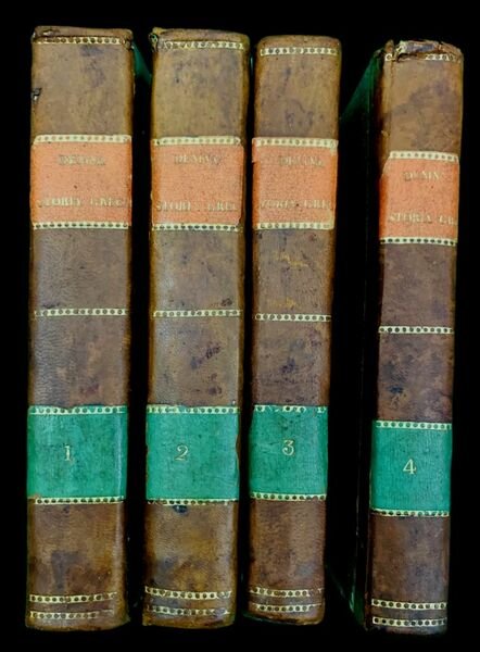 In 8° grande (21,8x13,5 cm); 4 tomi: (2 b.), (2), XVIII, 307, (5), (2 b.) pp., (2 b.), (2), 313, (7), (2 b.) pp., (2 b.), (2), 316, (2), (2 b.) pp., (2 b.), 256, (30 con numerazione errata 16, 227-240 che contengono il Discorso Accademico sopra l'Eccellenza de' Greci autori paragonati ai latini), (2 b.) pp. Testo completo. Tagli spruzzati in azzurro. Alcuni esemplari presentano due carte nei primi due volumi ma queste sono, sempre, assenti nei primi esemplari usciti dai torchi della Stamperia Reale, come il nostro che infatti non presenta nessuna traccia che lasci pensare ad una passata presenza delle due carte geografiche. Legatura coeva in mezza-pelle con piatti foderati da carta coeva. Ai dorsi fregi in oro, titolo su fascetta arancione in oro e numero del volume in oro su fascetta verde. Qualche minimo ed ininfluente difetto al margine superiore del dorso di due volumi, praticamente ininfluente, pochi quaderni con leggerissime ed ininfluenti piccolo foxing dovuto alla qualità della carta e nel complesso esemplare in buone-ottime condizioni di conservazione, stampato su carta forte. Prima non comune edizione di questa celeberrima storia politica e letteraria della Grecia, scritta dal celebre storico e presbitero italiano, Carlo Denina (Revello in provincia di Cuneo, 18 febbraio 1731 Parigi, 5 dicembre 1813). Personaggio dalle idee moderne si batté per tutta la vita contro i privilegi difesi dal corpo ecclesiastico, sostenendo anche che i preti dovessero collaborare con il potere statale per una gestione migliore del territorio. Storico attento ed apprezzato per il suo rigore, a lui si devono alcuni dei più importanti lavori storici della sua epoca come ad esempio questa storia greca o il suo celebre Istoria delle rivoluzioni d'Italia che ne fecero un personaggio famoso. Questa storia della Grecia antica analizza la storia greca attraverso la sua importante produzione letteraria, filosofica e scientifica ed intrecciando in modo abile ed innovativo i fatti storici veri e propri con le ripercussione che questi ebbero sulla produzione letteraria. Seppur non può esser considerata al livello di altri eccelsi lavori del Denina, quest'opera fu notevolmente apprezzata all'epoca ed ebbe diverse riedizioni. Prima edizione, non comune, stampata su carta forte di ottima qualità. Rif. Bibl.: IT\ICCU\TO0E\011211.
