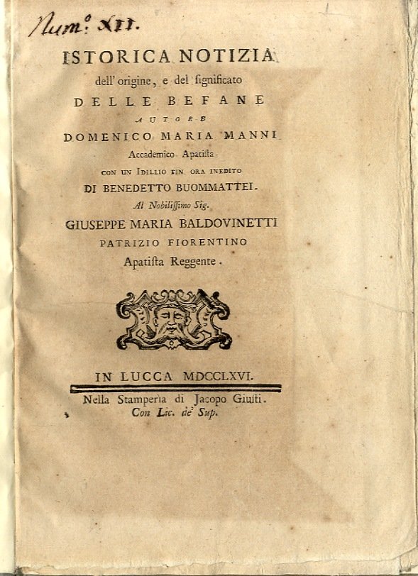 >in-8, pp. 34, cartonato muto ottocentesco. Non comune e curioso studio del Manni (1690-1788), Accademico fiorentino e prolifico autore di numerosi studi sugli argomenti più disparati. Questo in particolare è incentrato sulla figura della Befana e le credenze che aleggiano attorno alla sua misteriosa figura, le cui origini si fanno risalire al X-VI secolo a.C. Connessa ai riti pagani propiziatori legati all'agricoltura, era universalmente considerata la personificazione della Natura invernale. Condannata quindi dalla Chiesa, l'antica figura pagana femminile fu accettata gradualmente nel Cattolicesimo, come una sorta di dualismo tra il bene e il male. Il Manni dice "...che la Befana abita di soppiatto nelle gole de' cammini: che ella va a zonzo magicamente in tal notte perchè festa de' Magi: che pregata lascia regaletti ad alcuni putti nelle loro calze; ed altri nullameno ne cerca per forare loro il corpo: ad evitare il qual male il rimedio è trovato di mangiar fave, lo ché si usa tuttora da molte persone in quella sera; siccome il porsi un mortaio sul corpo, ed il pregare buono evento per via di un'oorazione apposta, detta l'Avemmaria della Befana..". Edizione originale. Ottimo esemplare, malgrado lievi bruniture in particolare alla prima ed ultima carta.
