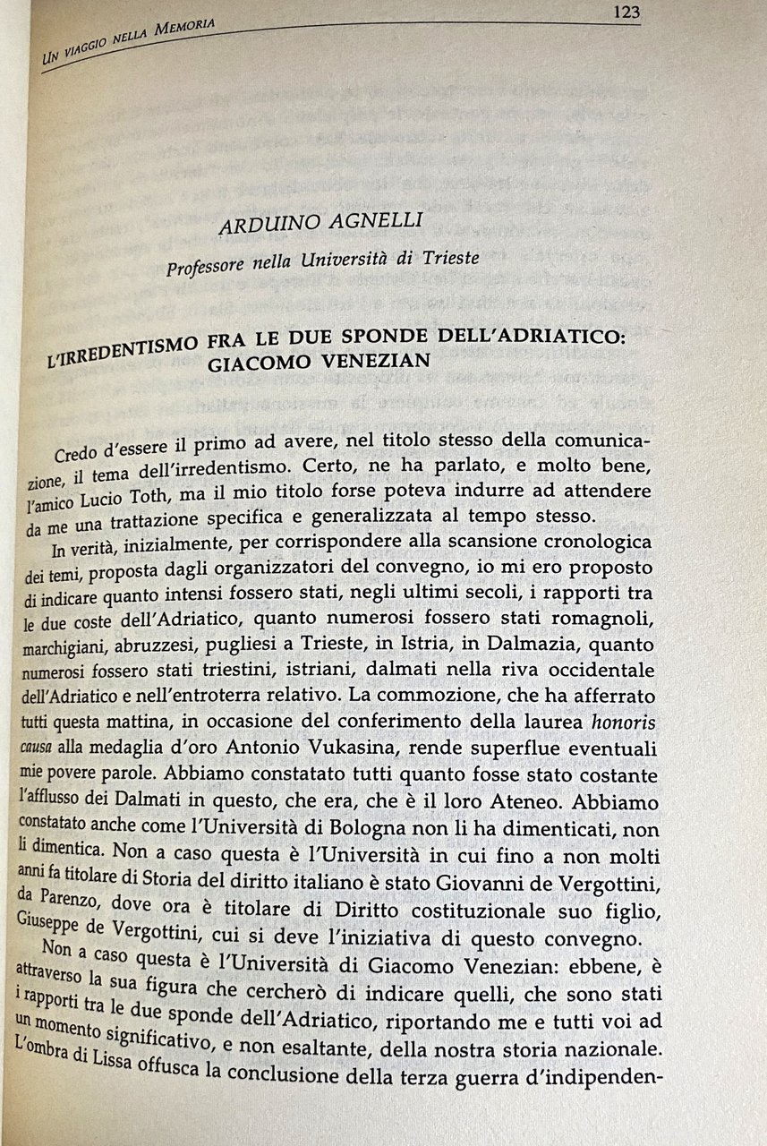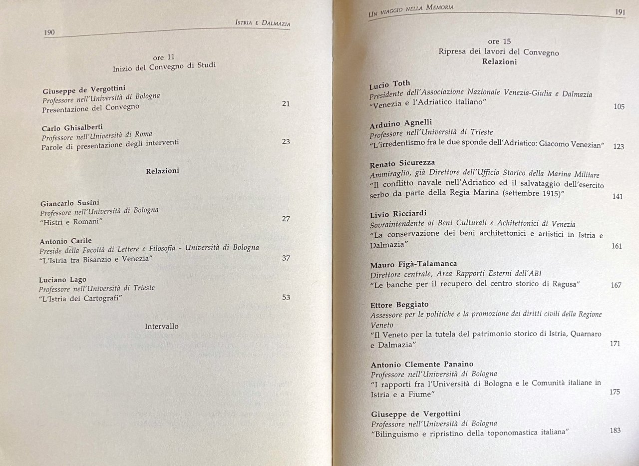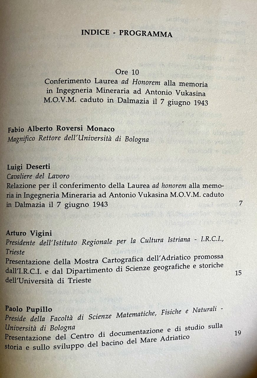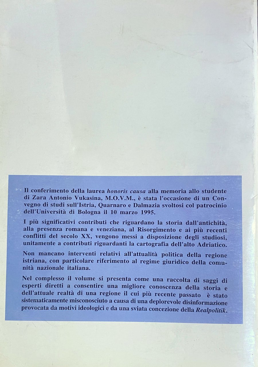 Il conferimento della laurea honoris causa alla memoria allo studente di Zara Antonio Vukasina, M.O.V.M., è stata l'occasione di un Convegno di studi sull'Istria, Quarnaro e Dalmazia svoltosi col patrocinio dell'Università di Bologna il 10 marzo 1995. I più significativi contributi che riguardano la storia dall'antichità, alla presenza romana e veneziana, al Risorgimento e ai più recenti conflitti del secolo XX, vengono messi a disposizione degli studiosi, unitamente a contributi riguardanti la cartografia dell'alto Adriatico. Non mancano interventi relativi all'attualità politica della regione istriana, con particolare riferimento al regime giuridico della comunità nazionale italiana. Nel complesso il volume si presenta come una raccolta di saggi di esperti diretti a consentire una migliore conoscenza della storia e dell'attuale realtà di una regione il cui più recente passato è stato sistematicamente misconosciuto a causa di una deplorevole disinformazione provocata da motivi ideologici e da una sviata concezione della Realpolitik.