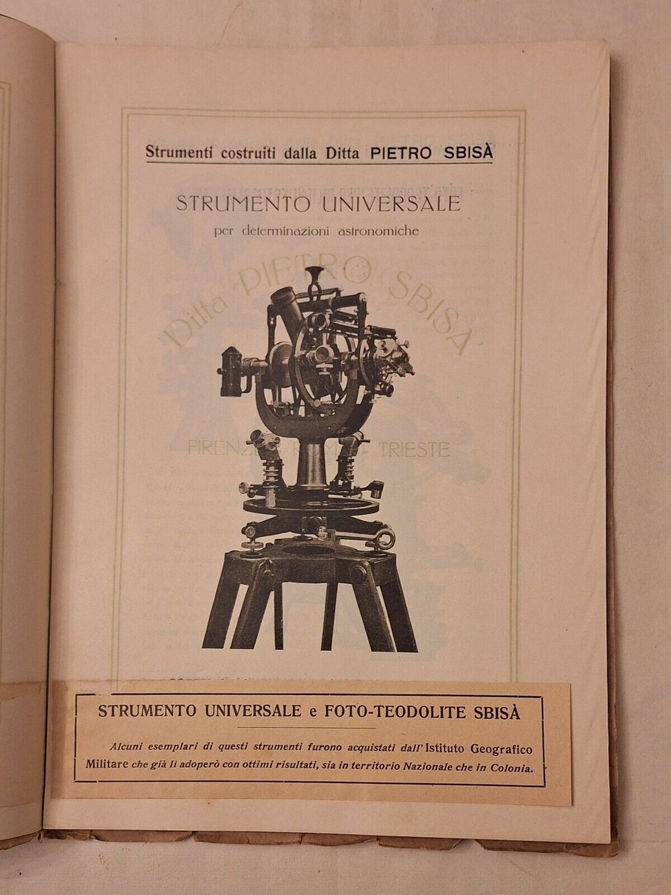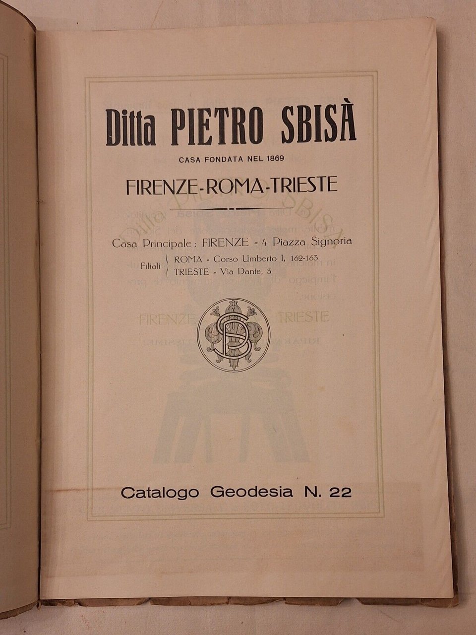 ISTRUMENTI PER INGEGNERIA DITTA PIETRO SBISA' CATALOGO GEODESIA N. 22 1926In 4°, legatura editoriale, pag. 73, ill. in b/n .Lievi segni alla copertina, pagine fresche e pulite.