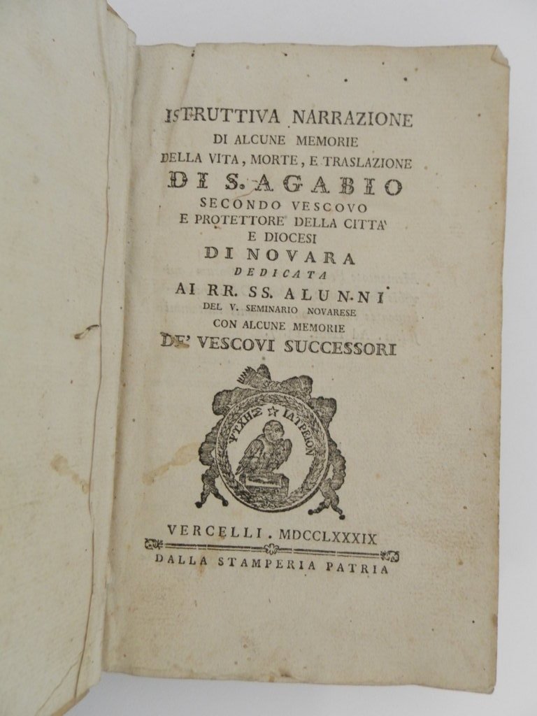 Istruttiva narrazione di alcune memorie della vita, morte e traslazione di S. Agabio secondo vescovo e proettore della città di Novara dedicata ai RR. SS. alunni del V seminario novarese con alcune memorie de vescovi successivi.