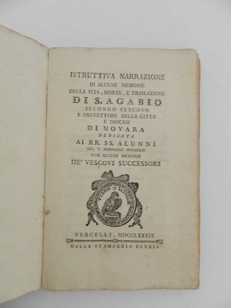 Istruttiva narrazione di alcune memorie della vita, morte e traslazione di S. Agabio secondo vescovo e protettore della città e diocesi di Novara dedicata ai RR. SS. alunni del V seminario novarese con alcune memorie de' vescovi successori