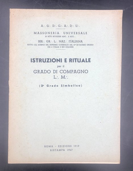 ISTRUZIONE e RITUALE per il GRADO di COMPAGNO L.M. (2° Grado Simbolico). Roma - Edizione 1919, ristampa 1947. A.G.D.G.A.D.U.