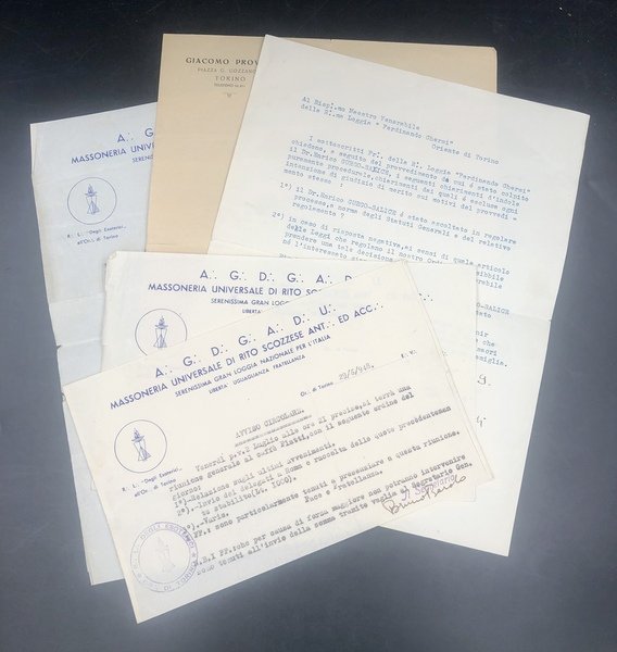 SER. GR. L. NAZ. ITALIANA sotto gli auspici del Supremo Consiglio del 33° ed ultimo Grado per l'Italia e le sue Colonie. In-8° (cm. 20,9x15,5), pp. 32. Allegati: 1) 3 fogli intestati Gran Loggia naz., uno da scrivere, uno con avviso circolare dattiloscritto 29/6/1948 e timbro, uno più grande dattiloscritto datato 4/9/ 1948. 2) Lettera di accoglimento domanda 16/3/1948, dattloscritta e firmata. 3) Lettera al maestro della Loggia Ferdinand Ghersi, dattil. e firmata da 3 "fratelli" con richiesta di informazioni sul provvedimento che ha colpito un "fratello", datata 5 gennaio 1950 E.V.