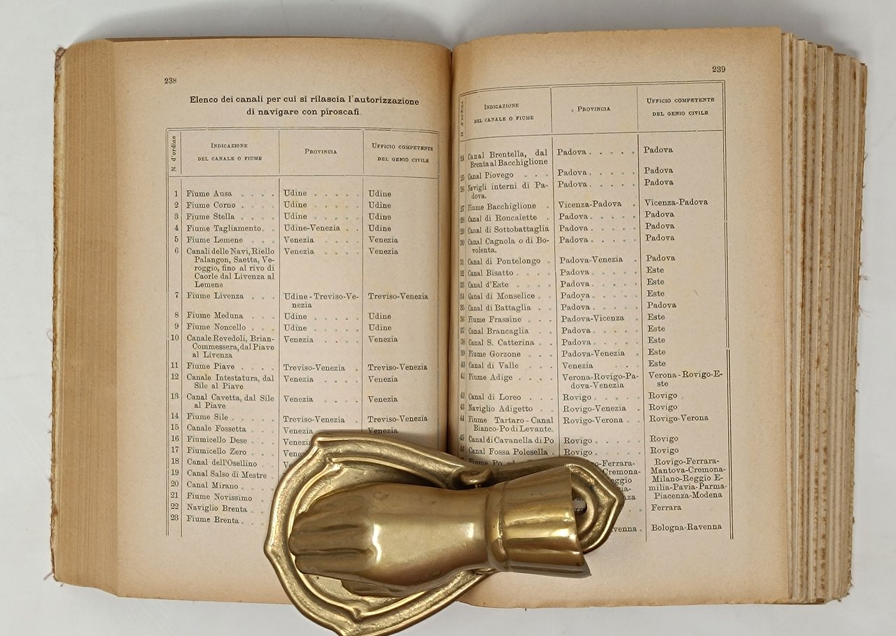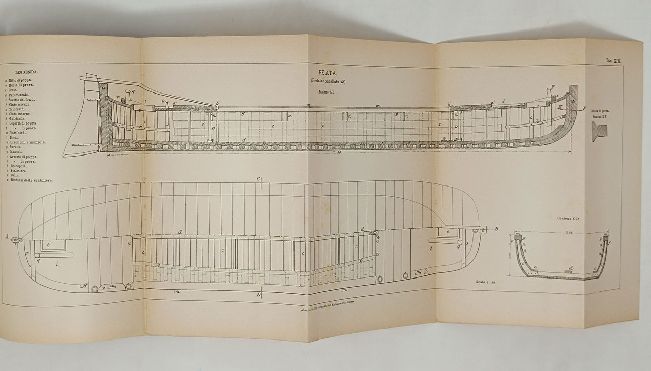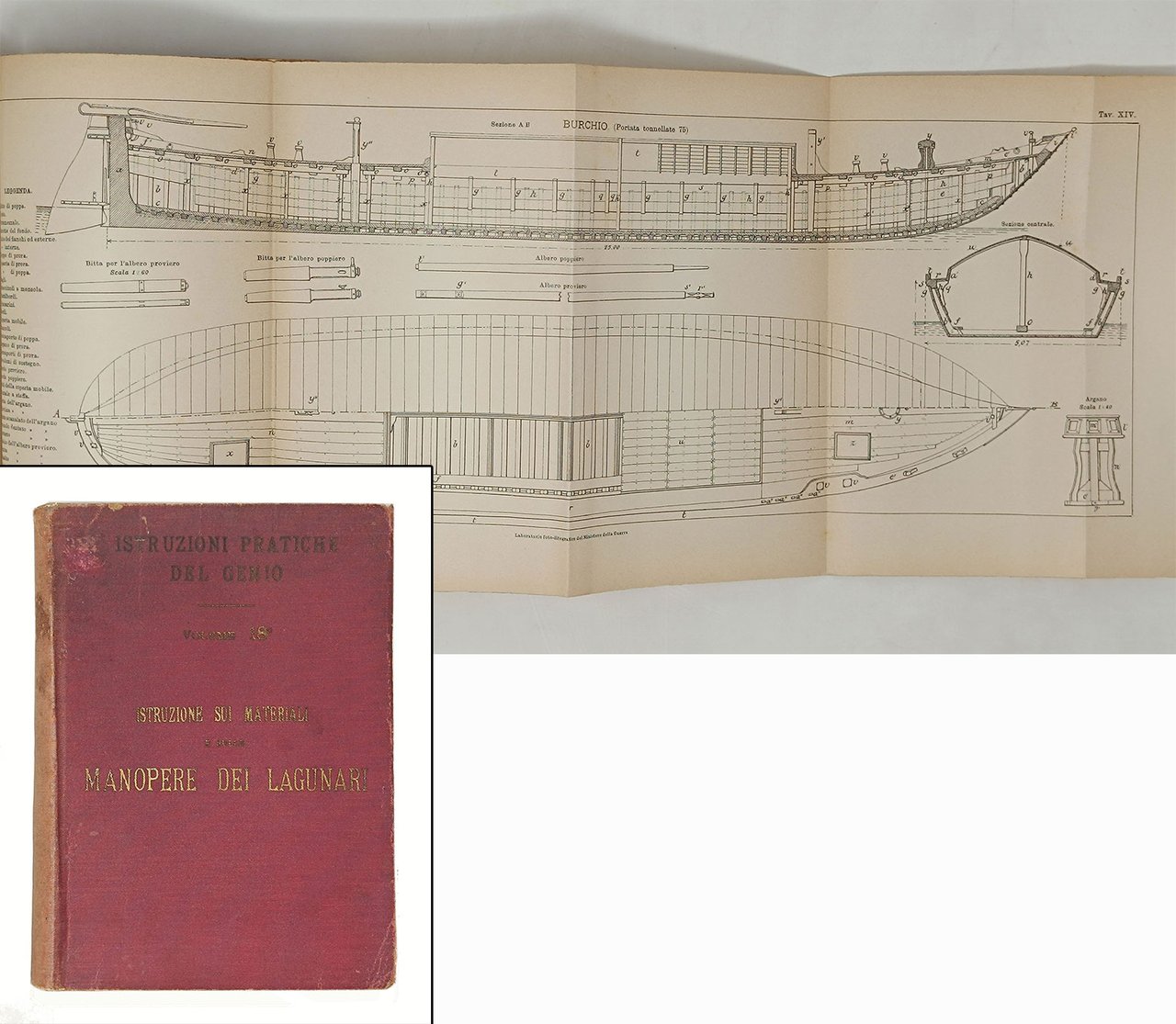 'Istruzione sui materiali e sulle manopere dei lagunari', volume 18° della serie 'Istruzioni pratice del genio'. Enrico Voghera, tipografo editore del Giornale Militare. Roma, 1905. Volume di 239 pagine di testo e XLII tavole illustrate in nero, più volte ripiegate su se stesse, rilegate al fondo del volume. Formato: 15 x 20,5 cm circa. Stato di conservazione: segni del tempo e dell'uso sulla coperta (che si presenta leggermente sgualcita, con il segno di un'etichetta adesiva (ora non più presente) e un numero a pennarello sul dorso, e con i titoli leggermente sbiaditi) ma, nel complesso, un esemplare buono. Interno decisamente ben conservato, privo di timbri, scritte o altri segni nel testo. Con qualche figura in nero nel testo. Molto belle e dettagliate le 42 tavole. Indice dei grandi capitoli: Avvertenze; Parte I: Nomenclatura, descrizione e conservazione del materiale: Capo I - Barce da trasporto; Capo II- Rimorciatori; Capo III- Norme per la conservazione del materiale; Parte II: Scuole felative all'impiego del materiale lagunare: Capo I- Scuola del barcaiuolo; Capo II- Scuola di vela; Capo III- Scuola di rimorchio; Capo IV- Scuola del pilota, Capo V- Scuola dei macchinisti e fuochisti; Parte III: Norme relative al servizio dei trasporti lagunari, Capo I- Trasporto di truppe e materiali, Capo II- Trasporto di quadrupedi, Capo III- Norme di contegno nei vari servizi. Appendici. Rara opera di militaria, riguardante uno specifico tema, difficilmente trattato in maniera esaustiva in altre opere. Molto dettagliate le tavole illustrative che riguardano idiversi mezzi di trasporto (nella loro interezza e, per alcuni di essi, nei dettagli delle parti componenti). Particolarmente curiose le tavole che riguardano 'barcone da 400', 'battellone da 100', 'battellone da 50', 'topo da M. 12, 'topo da m. 8,50 per truppa', 'gondola', 'barchetta a coda di gambero', 'omnibus', 'peata', 'rimorchiatore 3° tipo',. Brossura editoriale con copertina flessibile in tutta tela, con titoli in oro sul piatto anteriore.