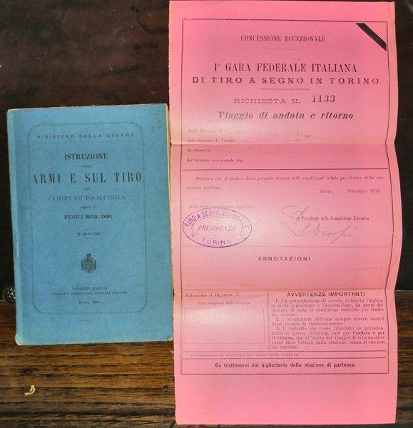In-16 (15,5 cm) VIII 197 (4). Brossura editoriale. In allegato una Concessione eccezionale per Prima Gara Federale Italiana di Tiro a Segno in Torino. Richiesta N. 1133. Viaggio di andata e ritorno. Firmata e timbrata. In-16 (15.5 cm) VIII 197 (4). Editorial paperback. Attached is an exceptional concession for the first Italian federal shooting competition in Turin. Request No. 1133. Round trip. Signed and stamped.