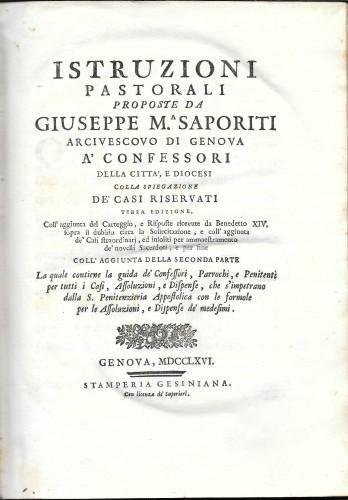 Istruzioni pastorali proposte da Giuseppe M. Saporiti arcivescovo di Genova à confessori della città e Diocesi colla spiegazione de' casi riservati. Coll'aggiunta del Carteggio, e risposte ricevute da Benedetto XIV. Coll'aggiunta della Seconda Parte la quale contiene la guida dè Confessori
