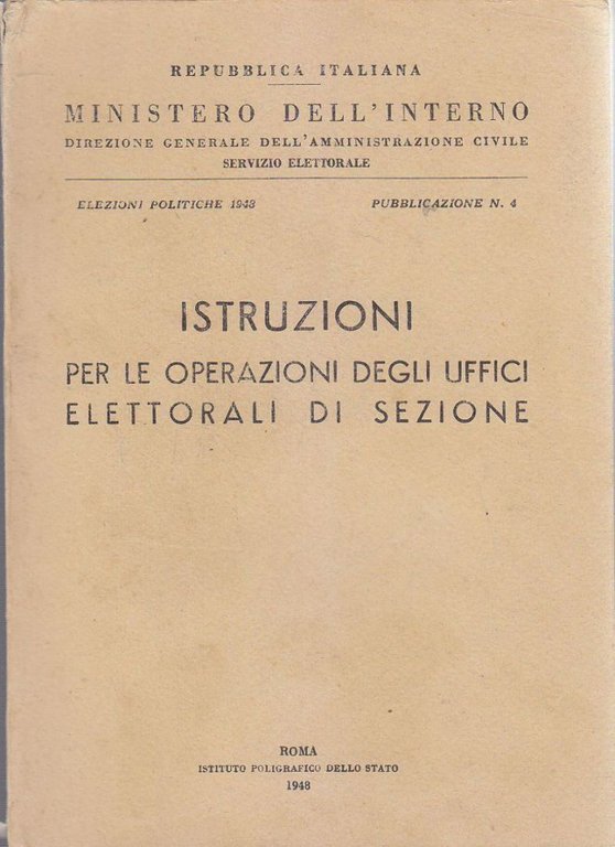 ISTRUZIONI PER LE OPERAZIONI DEGLI UFFICI ELETTORALI DI SEZIONE ministero dell’interno elezioni politiche 1948 istituto Poligrafico dello Stato 1948 189 Pagine Copertina editoriale in brossura Dimensioni: 15 x 20,5 cm Stato di conservazione: molto buono (pagine normalmente ingiallite)