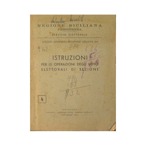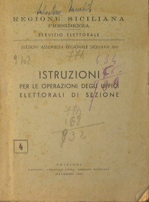 Elezioni Assemblea Regionale Siciliana 1951 - in 16° - pp.113 - Brossura editoriale - Fogli intonsi - Scritte a penna e matita colorata al piatto superiore