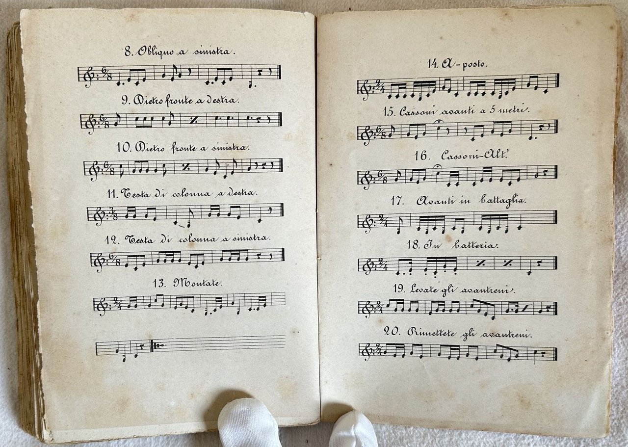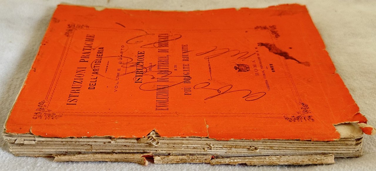 Interessante manuale del 1877 sulla Istruzione di batteria di brigata e di più brigate riunite, volume quarto della collana "Istruzione pratiche di artiglieria". All'interno istruzione teorica e pratica, guida, alineamento delle evoluzioni di batteria, ispezioni, Ordini di una batteria, Scuola di sezione, Scuola di batteria, Evoluzioni di brigata, Evoluzioni di più brigate riunite ec. Alla fine alcune partiture delle suonerie e segnali di tromba pell'artiglieria. In discrete condizioni ma completo. Copertina editoriale in discrete condizioni generali con usure ai margini. Dorso mancante. Legatura quasi assente. Pagine in buone condizioni con rare fioriture. In 16. Dim. 16,5x11,5 cm. Pp. 165+(3)+(12). Interesting manual of 1877 about the instruction of batteria of brigata and more batteries united, volume fourth of the series "Istruzione pratiche di artiglieria". At the end some scores of signals of truimpets of artigllery. In fair conditions but complete. Editorial cover in fair conditions lightly worn in the edges and spine missing. Binding almost lacks. Pages in good conditions with occasional foxing. In 16. Dim. 16,5x11,5 cm. Pp. 165+(3)+(12).