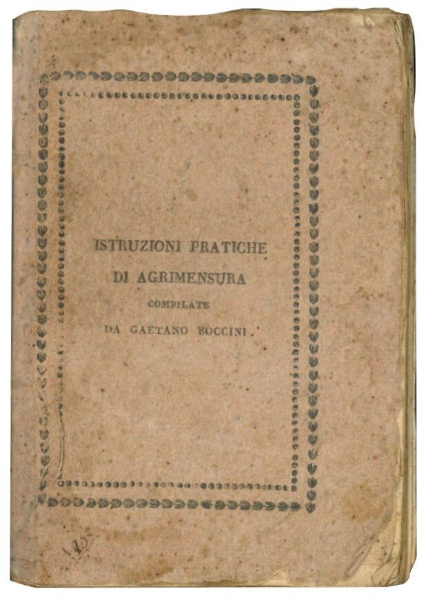 Mm. 155x107. Pp. 102, [2], IV cc. di tavv. ripieg. Trattato di agrimensura di Gaetano Boccini cui é aggiunto il Trattato di Cosimo Trinci sopra le stime di beni del suolo. A differenza di un'altra opera di Trinci piuttosto nota, L'agricoltore sperimentato, questo suo saggio fu a lungo ignorato fino a quando non venne riproposto nel 1825 da Cosimo Boccini in questo volume. Brossura editoriale originale con titolo alla cop. ant. (restauro manuale al dorso, presenti annotazioni manoscritte alla c. di sguardia e al frontespizio).