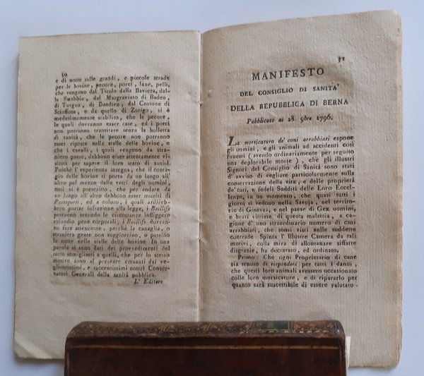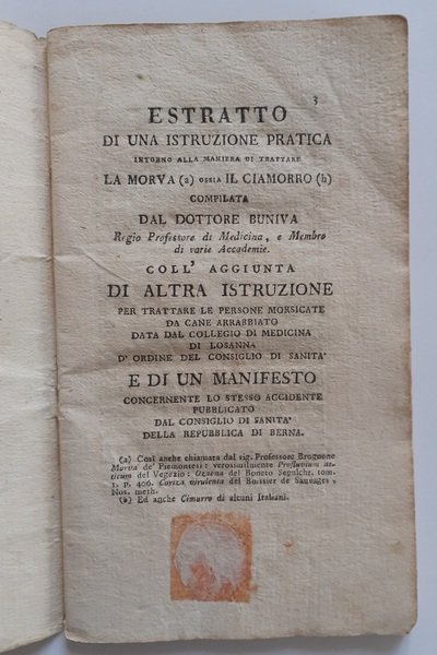 In 8° piccolo; 43, (1) pp. Senza brossura ma non slegato con ben visibile il cordone originale. Un antico stemma nobiliare applicato al frontespizio nel margine basso che disperso nel tempo, ha lasciato solo in parte visibile l'immagine a secco. Esemplare in buone-ottime condizioni di conservazione. Prima edizione, assai rara, due soli esemplari presenti in ICCU, di questa pubblicazione di interesse veterinario, del celebre medico piemontese, Francesco Michele Buniva (Pinerolo 1761 - 26 ottobre 1834 Pescina). Durante gli studi di medicina si avvicinò alla veterinaria, disciplina in fortissima ascesa in quegli anni a Torino, grazie all'influsso del Brugnone che era in collegamento con la prima scuola di veterinaria aperta in Europa a Lione nel 1761. Proprio in collaborazione con il Brugnone, appena finiti gli studi si interessò alle ricerche sul sangue di alcuni animali infetti. Proprio per questi studi, nel 1789, venne chiamato alla cattedra di Torino di Medicina. Nel 1790 era già membro della Société Royale de Medicine di Parigi, dell'Accademia dei Georgofili e della Società agraria di Milano, a al suo attivo poteva vantare parecchie ricerche di medicina veterinaria, di meccanica e di agronomia ma, soprattutto, un lavoro fondamentale, il Nomenclator linneanus Florae Pedemontanae, edito a Torino nel 1790, utile chiave per concordare la nomenclatura e la posizione sistematica delle specie indicate da Linneo con quelle indicate dall'Allioni. Notevoli anche i suoi studi di agronomia e di ingegneria. La guerra contro la Francia del 1792, portò il territorio sabaudo ad essere colpito da innumerevoli epidemie che attaccarono gli allevamenti. Buniva fu spinto da questi fatti a concentrare i suoi studi sulla ricerca e la cura di alcune di queste patologie. E' proprio da questi studi nasce l'opera qui presentata. Si legge dalla Treccani "Il conflitto con la Francia conclusosi nel maggio 1796 lasciava dietro di sé - osservava il B. in un opuscolo del 1797, Istruzioni riguardanti la morva, ossia il ciamorro, e l'idrofobia -, complice il passaggio dell'esercito austriaco, uno strascico di infezioni e di morbi epizootici quali il Piemonte non conosceva più da mezzo secolo. Estremamente gravi si presentavano, in particolare, i vuoti aperti dalla epizoozia bosungarica nel patrimonio bovino, per il cui risanamento egli dettava in quello stesso anno una Memoria intorno alle provvidenze contro la corrente epizoozia nelle bovine con l'aggiunta delle memorie del grande Albert Haller sul contagio del bestiame, destinata ai "parroci, agli agronomi e ai medici" perché la diffondessero fra i contadini "a guisa d'istruzione a vantaggio dello Stato". In campo politico, proprio in questi anni, l'autore si avvicinò agli ambienti giacobini. Iscritto alla loggia massonica pinerolese, nel 1798, fu una delle figure di spicco del governo provvisorio repubblicano. Alla caduta del governo provvisorio riparò in Francia, dove per la Sua fama, entrò a far parte del corpo docente della scuola di Veterinaria di Lione e all'Hôtel-Dieu con il naturalista Gilbert. ". nei primi mesi del 1800, munito delle credenziali del più famoso veterinario d'Europa, l'Huzard, raggiunse Londra per assistere alle prime esperienze di inoculazione del vaccino scoperto da Jenner contro il vaiolo". Ritornato in Piemonte su suo diretto intervento, venne istituita la Commissione per la vaccinazione del quel, Buniva divenne direttore, scontrandosi con diversi studiosi contrari all'inoculazione del vaccino contro il vaiolo, non dimenticandosi mai delle ricerche ai malanni del carbonchio fra i bovini. Sempre a lui si devono importanti studi e contributi al contenimento della febbre gialla e all'estendersi della pellagra. Negli anni seguenti ricoprì importantissime cariche legate alla pubblica igiene, oltre a continuare l'insegnamento. Buniva è considerato uno dei primi veterinari italiani nel senso moderno del termine. Opera assai rara. Rif. Bibl.: IT\ICCU\TO0E\049006.
