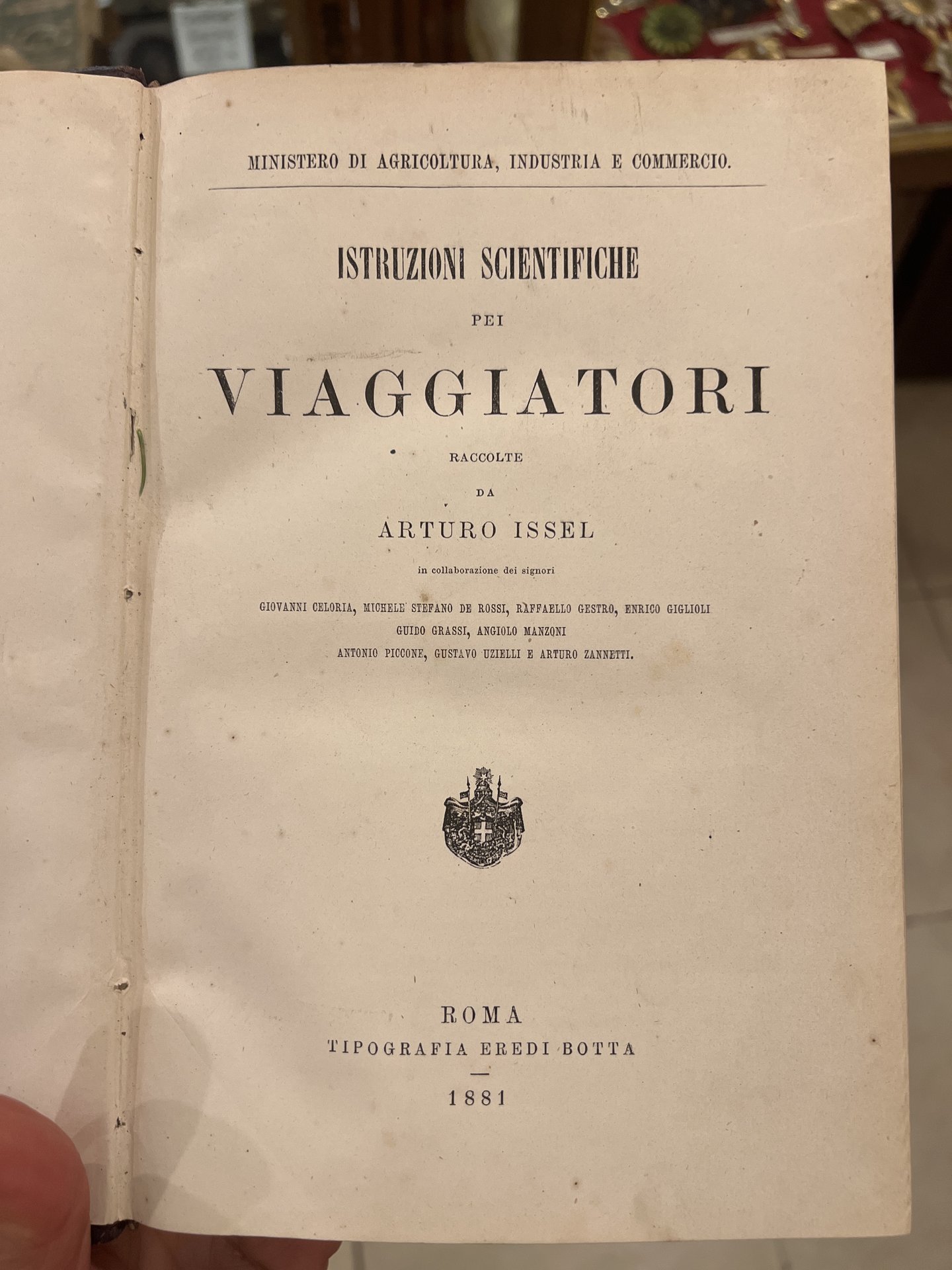 Vol. unico, in -8, pp. XII, 556 (2), n. 5 tavole f.t. incise, legatura coeva in mezza pelle, dorso liscio con titoli e filetti in oro, qualche lieve fioritura sulle pegine, lievi screpolature ai piatti. UN CURIOSO LIBRO SCIENTIFICO PER I VIAGGIATORI, si parte dall'astronomia per arrivare alla meterologia, passando per la fisiologia, etnologia e argomenti vari.