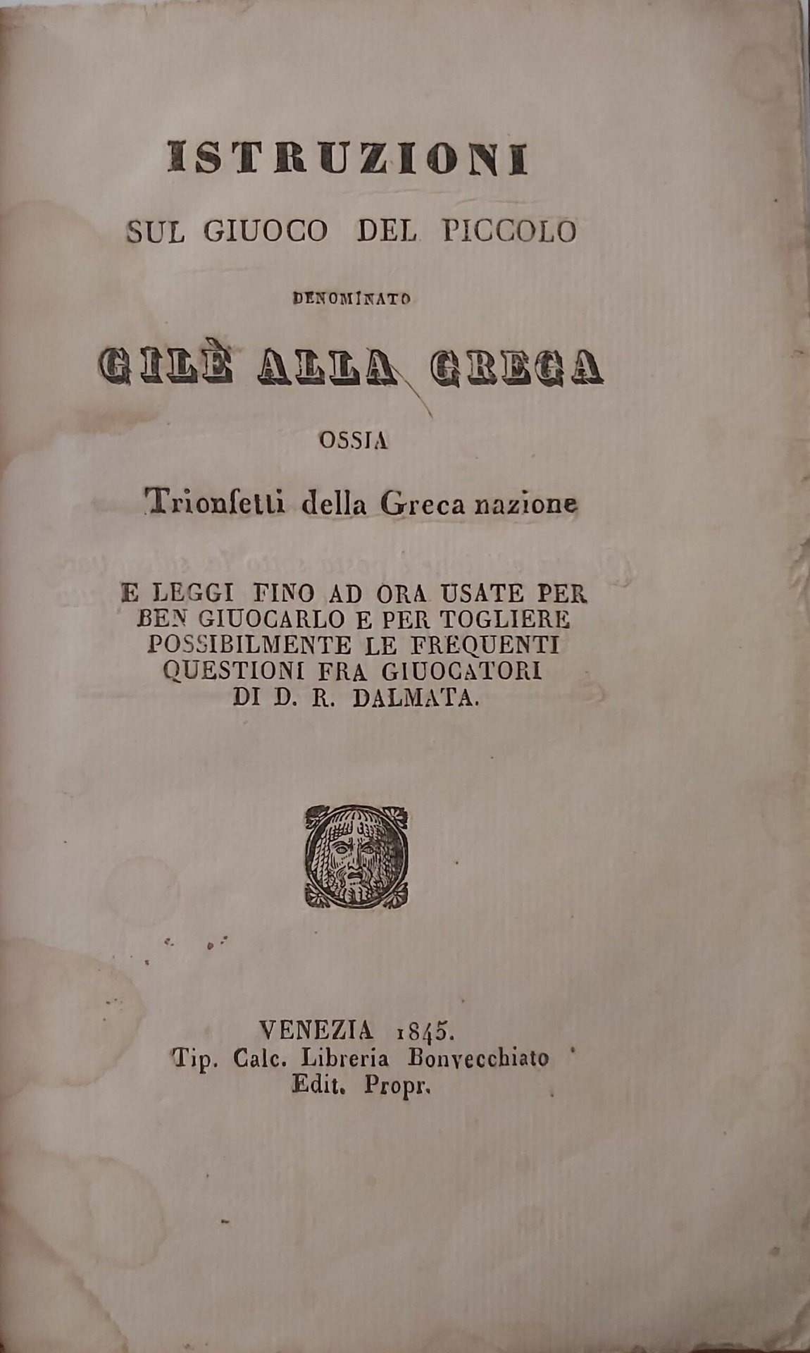 in-16, pp. 24, bross. edit. cop. color. muta coeva. Raro trattato di anonimo autore originario della Dalmazia la cui volontà è di mettere per iscritto per la prima volta le regole di un gioco importanto dal Levante attraverso le flotte venete. Prima rara edizione introvabile poi ristampata nel 1889, questa successiva edizione è censita in sole 2 copia da Iccu (Bibl. Naz. Centrale Firenze e Marciana Venezia). Lenzi. Bibliografia giochi di carte, n.80: "Tratteggia l'origine di questo gioco e ne dà poi le regole". Lieviss. gora sulle prime 3 cc. [693]