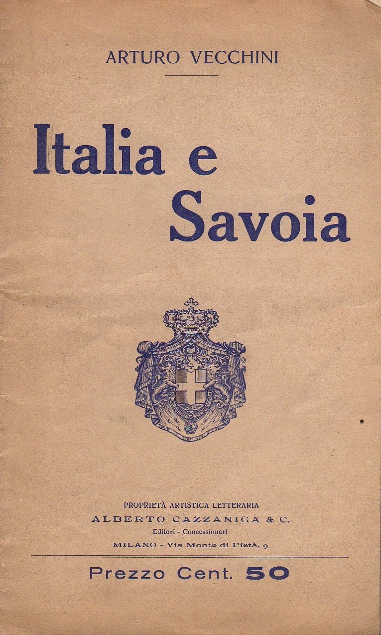 un opuscolo cm 21,5 x 13; pp. 23; leg. in brossura ed. con cartoncino leggero color sabbia, titolo a caratteri blu al piatto ant., pubblicità ed. al piatto post.; discorso celebrativo dei Savoia a cura di Arturo Vecchini (1857-1927, deputato, avvocato, letterato, poeta, traduttore, giornalista, oratore, insegnate di filosofia, direttore di vari periodici, sindaco di Ancona, nato e morto ad Ancona); opera poco diffusa, censita in poche Biblioteche italiane. Rif.: IT\ICCU\CUB\0656114. Cond.: in buone condizioni generali.