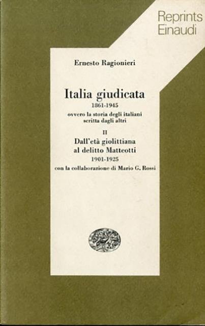 VI, P. 251-557 p. ; 19 x 12 cm . Reprints Einaudi, 91. È un'originale storia dell'Italia unita questa che Ernesto Ragionieri ha ideato: documentare come vari stranieri, viaggiatori, studiosi, uomini politici, ecc., videro il nostro paese. In questo volume, secondo dei tre in cui l'opera si articola, siamo all'aprirsi del nuovo secolo. Quello che maggiormente colpisce gli osservatori è il rapido sviluppo dell'economia italiana. D'altra parte, molti osservatori arrivano a rilevare non solo gli squilibri interni - soprattutto nell'agricoltura - ma anche l'arretratezza sociale e la sproporzione fra progresso materiale e progresso intellettuale. Con la collaborazione di Mario G. Rossi. Brossura editoriale, coperta in cartoncino flessibile colorato (b/n e verde). Titolo impresso in nero al piatto e al dorso. Codice libreria 8191.