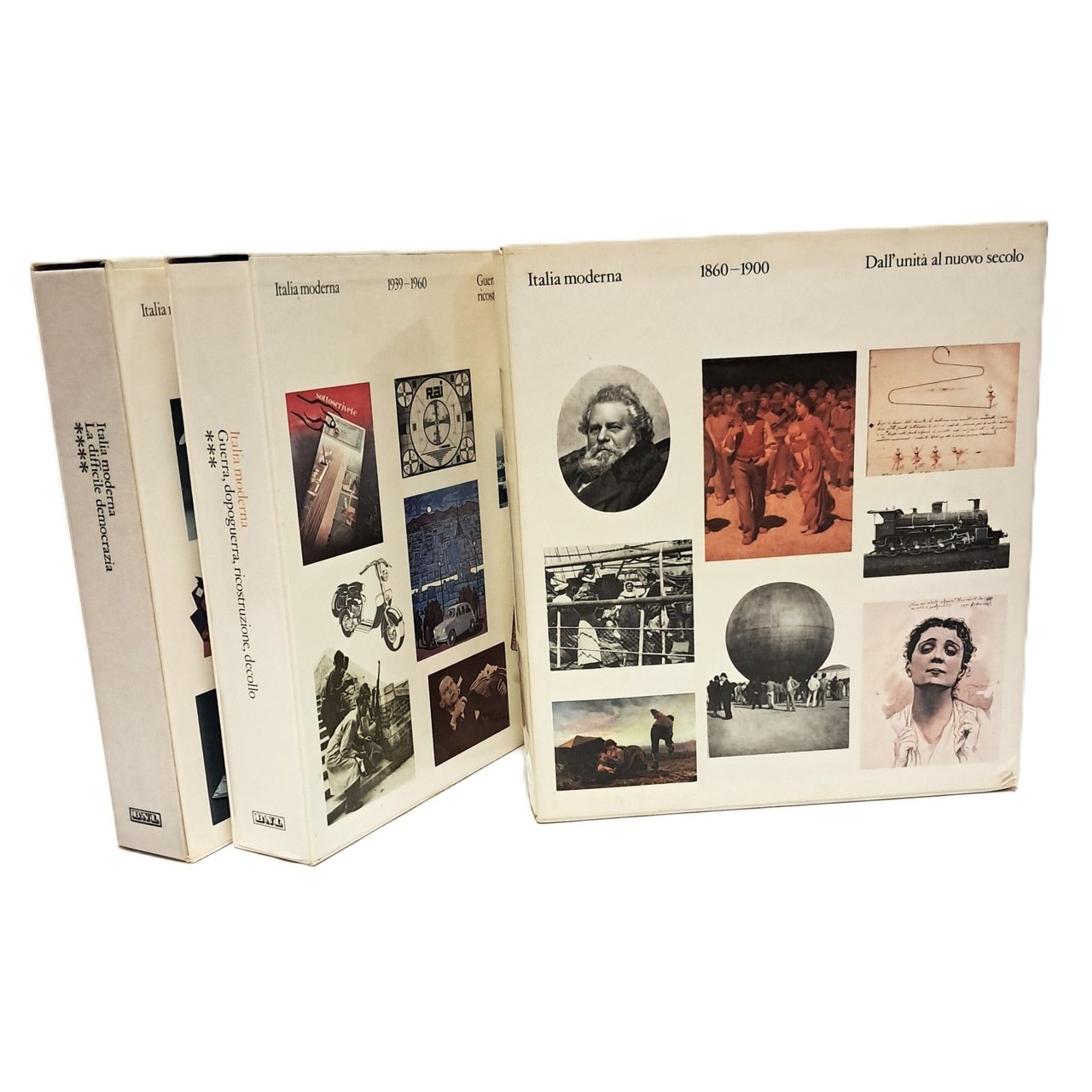 PRIMA EDIZIONE edita a cura della Banca Nazionale del Lavoro, diretta da Carlo Pirovano; in quattro volumi divisi per anni: Dall'Unità al nuovo secolo 1860-1900 (I); Dall'espansione alla seconda guerra mondiale 1900-1939 (II); Guerra, dopoguerra, ricostruzione, decollo 1939-1960 (III); La difficile democrazia 1960-1980 (IV) Monografia storica divisa per argomenti che coprono dei lassi temporali che vanno dall'unificazione dell'Italia all'età contemporanea. IL testo è organizzato sotto forma di saggi visivi, vale a dire di testo accompagnato da immagini che ne fissano le caratteristiche e servono da commento visivo. Il primo volume (1860-1900) è focalizzato sul Risorgimento e l'unità nazionale: Il mito del Risorgimento e l'esaltazione dell'Unità, L'Unità incompiuta, I volti del potere, Il territorio, La produzione, L'organizzazione della cultura, Verso le comunicazioni di massa, L'Italia e gli altri (pp. 555). Il secondo volume incornicia il periodo storico che va dall'Italia post-unitaria alla seconda guerra mondiale: L'Italia liberale, Il fascismo e la sua rappresentazione, Le smagliature del regime, L'Italia in guerra, Il territorio, La produzione, L'organizzazione della cultura, Il costume e le comunicazioni di massa (pp. 555). Il terzo volume va dalla guerra al boom economico degli anni sessanta: Maturità e crisi della società italiana durante il fascismo, L'Italia in guerra, Il dibattito sulla ricostruzione, Due mondi politici a confronto, L'Italia del miracolo, Città e territorio, Le arti e le lettere, Le comunicazioni di massa (pp. 555). Il quarto volume si concentra sulla contemporaneità e sulle difficoltà politiche e sociali italiane: Il miracolo e la crisi, L'ondata del Sessantotto e l'ascesa delle sinistre, Le disfunzioni del sistema, La società in trasformazione, Città e territorio, La produzione, La cultura, Le comunicazioni di massa (pp. 553). Copertine cartonate con sovraccoperte illustrate e cofanetti. Manca la sovraccoperta al quarto volume.