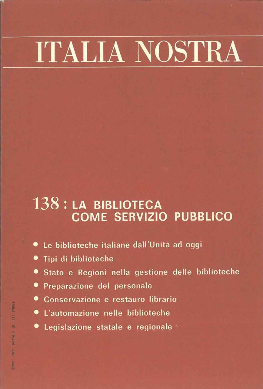 Italia nostra. Bollettino dell'associazione nazionale "Italia Nostra". Anno XVIII, n. 138, ottobre 1976. La biblioteca come servizio pubblico