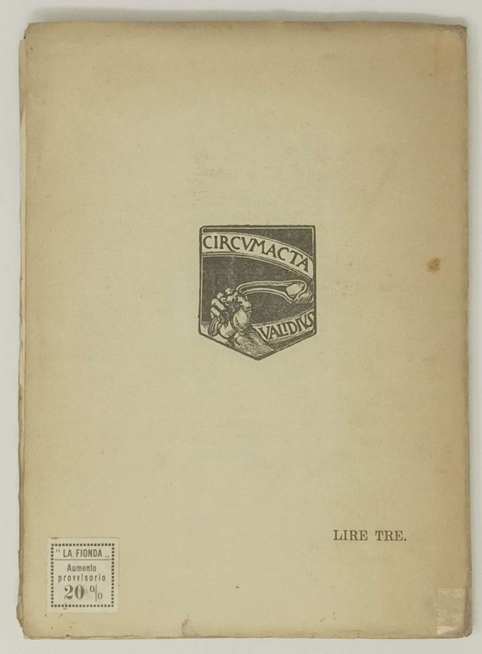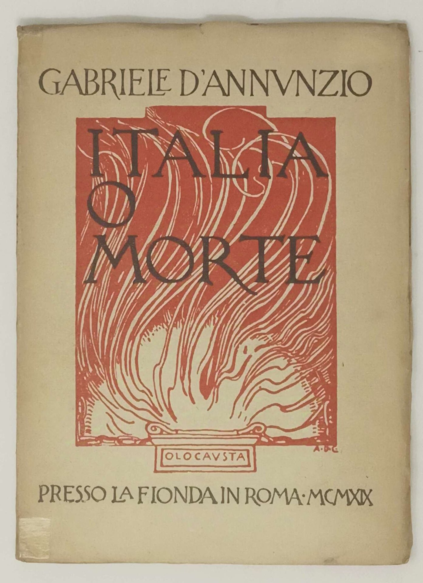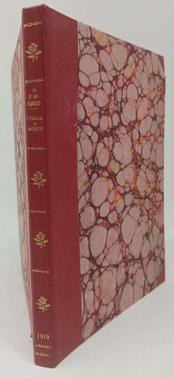 >in-16 (mm 200x140), pp. 61 (3bb.), brossura editoriale con bella incisione in sanguigna di De Carolis sulla copertina anteriore e l'impresa "Circumacta validius" in nero su quella posteriore, protetta da camicia in m. pelle e angoli con titolo e fregi oro al dorso. Su carta grande e forte. Contiene due discorsi di contenuto "fiumano": "Italia o morte", che dà il titolo al volume, già apparso sulla "Gazzetta del Popolo" di Torino, e "La Pentecoste d'Italia", già pubblicato su vari quotidiani. Edizione originale, buono stato di conservazione. De Medici n. 100. Guabello n. 285. Vecchioni n. 59. Falqui p. 37