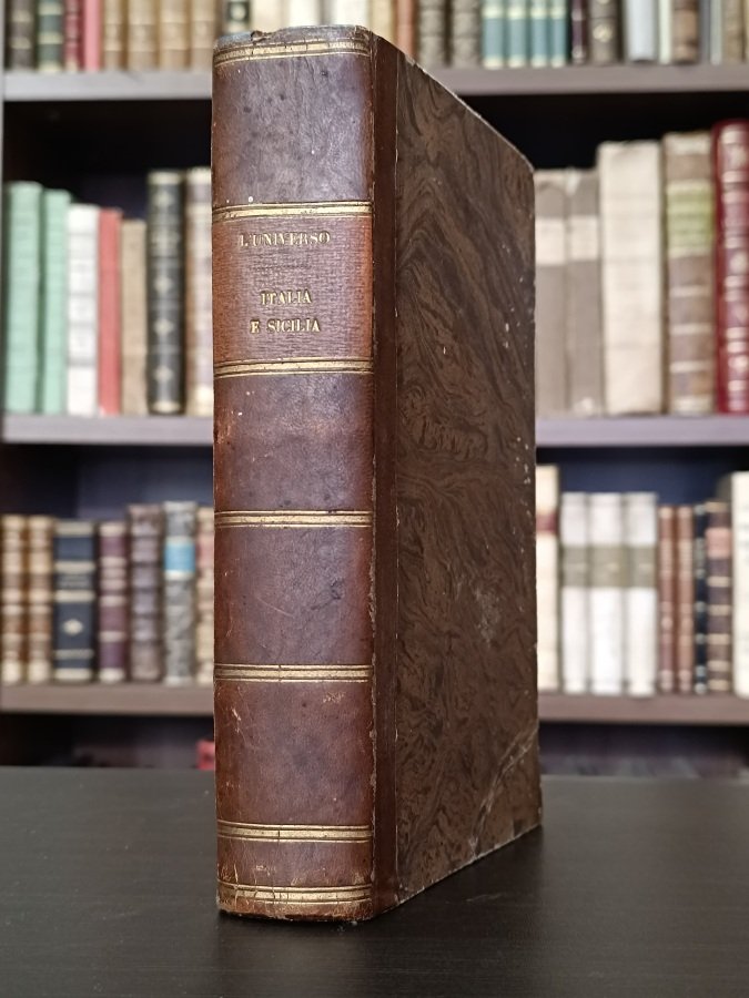 2 volumi in 1 in-8° (cm. 20,8), legatura coeva in mezza pelle, dorso liscio con titolo in oro su tassello e filetti in oro, piatti marmorizzati, tagli gialli; pp. [2] 376; 96 [2] con 120 tavole fuori testo (nn. 96 per l'Italia e nn. 24 per la Sicilia), in stato molto buono; alcune fioriture sparse. Prima edizione italiana tratta dall'originale francese del 1835. Interessante e non comune guida d'Italia e della Sicilia riccamente illustrata da belle tavole incise in rame. Il volume a se stante fa parte della collana «L'universo pittorico: ossia storia e descrizione di tutti i popoli delle loro religioni, usi, costumi». Esemplare molto buono. (NB6)