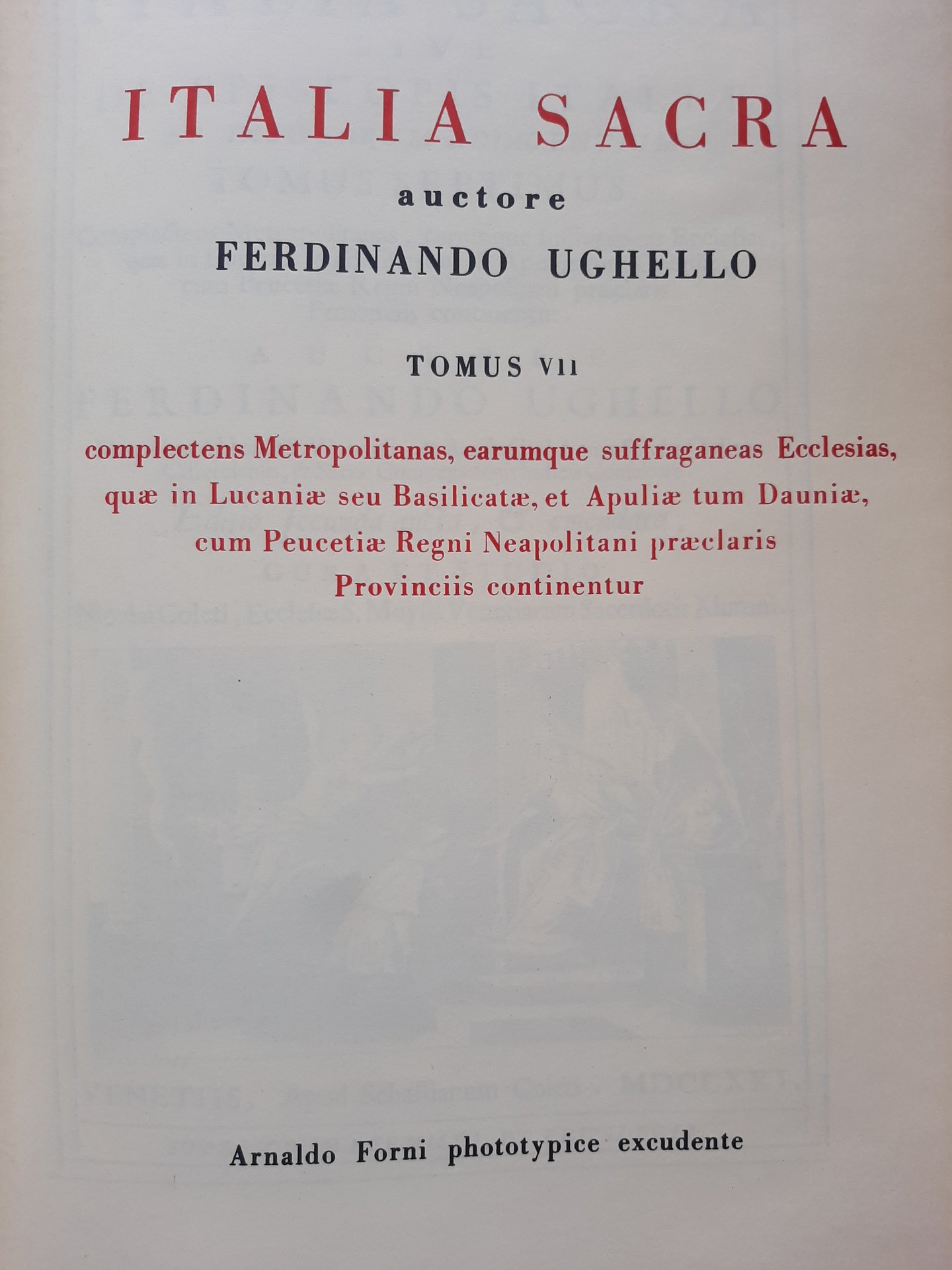 Italia sacra tomus 7: complectens Metropolitanas, earumque suffraganeas Ecclesias, quae in Lucaniae seu Basilicatae, et Apuliae tum Dauniae, cum Peucetiae Regni Neapolitani praeclaris Provinciis recensentur.