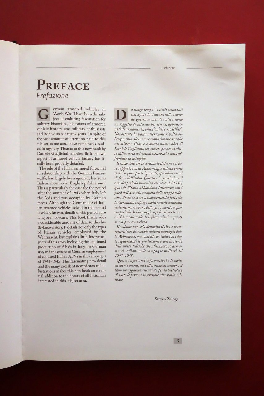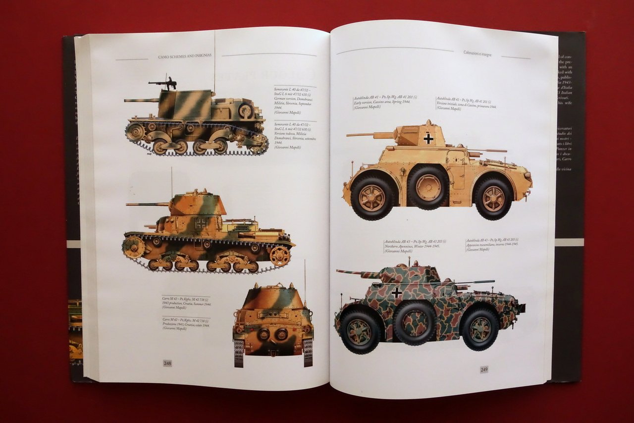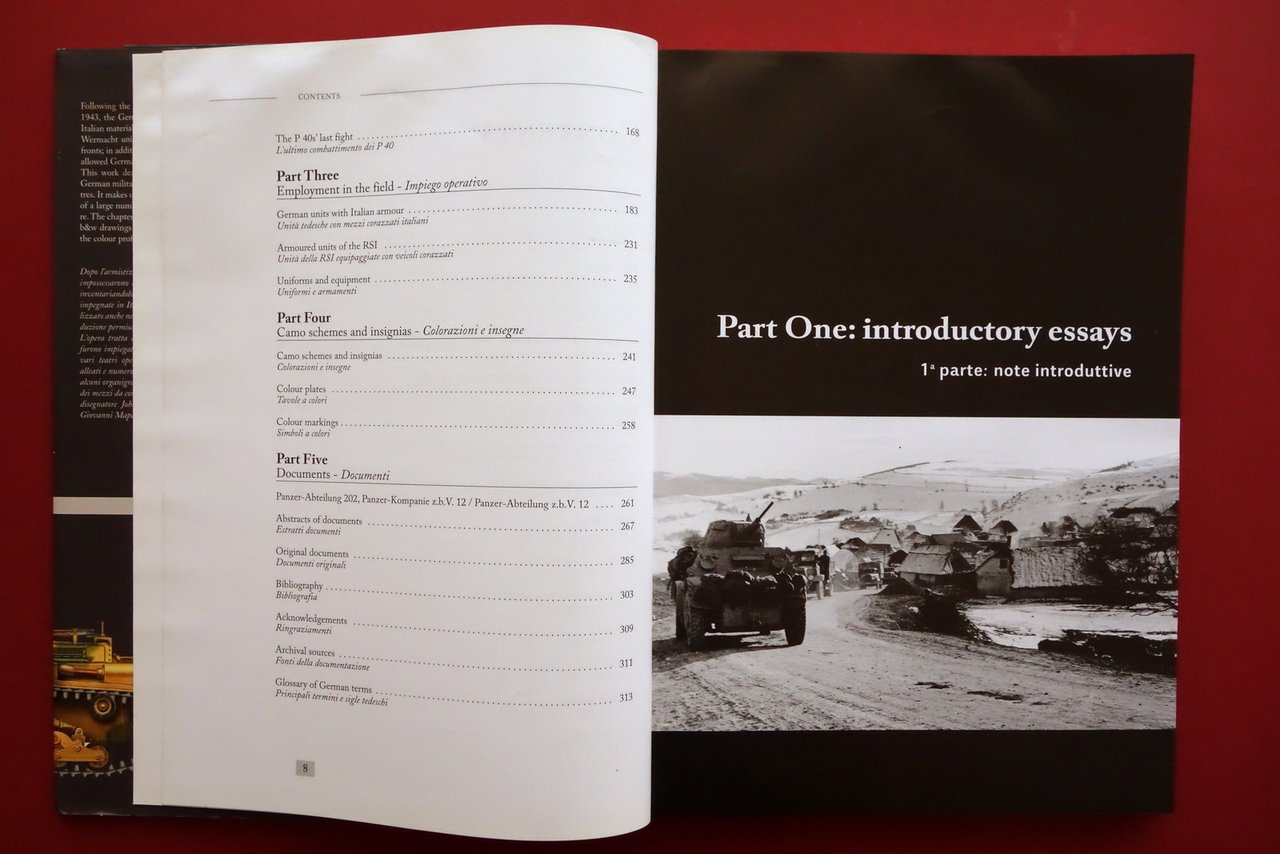 Daniele Guglielmi, Italian Armour in German Service 1943 - 1945 - Veicoli corazzati italiani impiegati dalle unità militari tedesche 1943 - 1945 Roadrunner, Fidenza 2005; cm 30x21,5; pp. 316 con numerosissime belle ill. in b/n nel t. e fuori t. (alcune a colori); tutto cartonato ed. telato con sovraccoperta ed. ill. a colori. Edizione bilingue inglese - italiano. Condizioni di conservazione Buone condizioni con leggere tracce d'uso alla sovraccoperta ed., che risulta minimamente sgualcita alle cuffie; angolo superiore destro del piatto ant. e di numerose pagine con lievi ondulazioni dovute a prolungata esposizione a fonte di umidità (al piatto sono pressoché trascurabili; vedi foto); interni peraltro ottimi. Per ulteriori dettagli vedi foto. Raro. Edizione bilingue inglese - italiano. SETT190.L26814 N