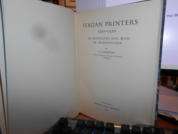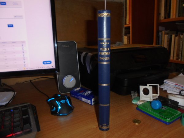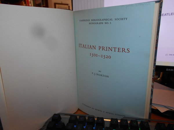 F.J. Norton. London, Bowes and Bowes, 1958. ITALIAN PRINTERS 1501 - 1520 an annotated list, with an introduction. In-8°, m. pelle con fregi e titolo in oro al dorso, brossure originali conservate. xxxiv, 177 pp. con 11 riproduzioni in tavole fuori testo stampate su carta patinata. Perfetto esemplare in legatura di pregio con le copertina originali conservate. Uff. E - II - 6 - 2