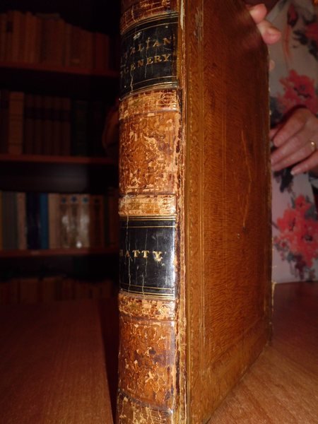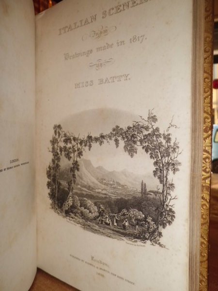 BATTY, Elisabeth. Italian Scenery from drawing made in 1817. London, Rodwell & Martin, 1820. In - 8° grande piena pelle con impressioni a secco, taglio dorato (cop. anteriore staccata) (10), 197, (1) pp. Frontespizio con vignetta incisa al centro e veduta del Vesuvio come vignetta finale, con 60 belle vedute incise in acciaio fuori testo. A parte il difetto alla legatura l' esemplare è ottimamente conservato. Brunet, I, 701 - 2: Les vignettes de ce livre sont, en général d' un effet agréable. Cremonini, L' Italia nelle vedute, 93.