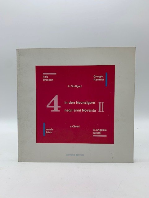 In 8, cm. 21 x 21, pp.54 + (2), con 32 tavole a colori a piena pagina nel testo. Brossura editoriale. Leggere tracce di polvere alla coperta. In ottimo stato. In occasione del gemellaggio artistico tra l'Istituto Italiano di Cultura di Stoccarda, l'Ufficio Culturale di Stoccarda e la Regione Piemonte con l'Assessorato alla Cultura e' stata realizzata la mostra che ha visto l'esposizione delle opere di 4 artisti che spaziano dalla pittura alla scultura. La mostra e' stata ospitata prima a Stoccarda, Galerie Unterm Turm dal dicembre 1998 al 24 gennaio 1999, e poi a Chieri, Palazzo Opesso dal 30 gennaio al 28 febbraio 1999. I testi di Susanne Grotz, Gunter Wirth e Piero Mantovani sono in italiano e tedesco.