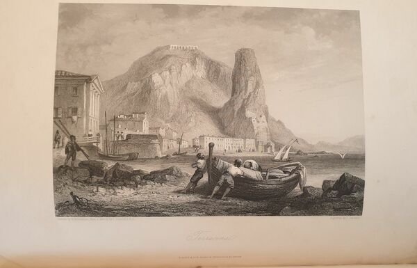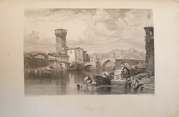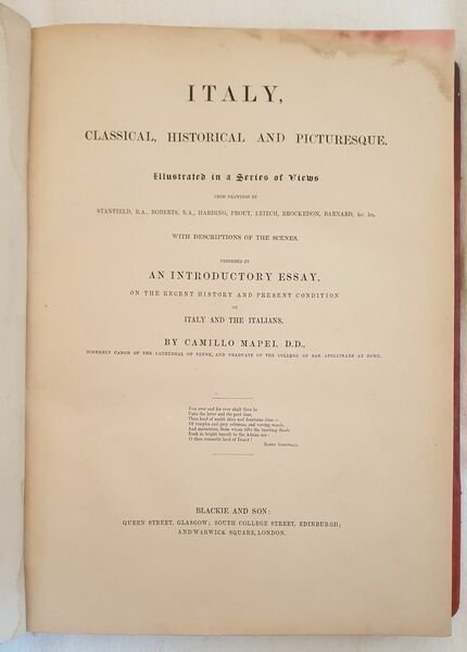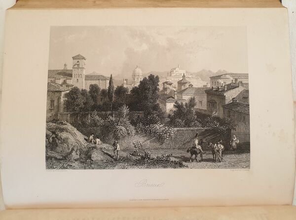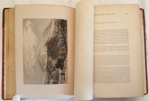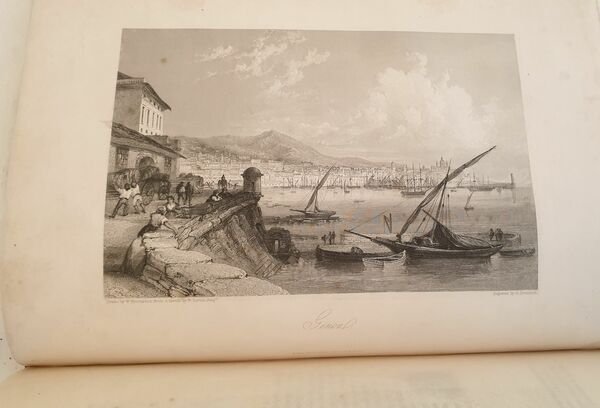 Prima edizione del 1843 circa di questa finissima opera di vedute italiane di Camillo Mapei (1809-1853) sacerdote e teologo italiano. Mapei fu tra le figure di spicco del protestantesimo italiano del periodo risorgimentale, nonché patriota ed esule politico. Le vedute sono tratte dai disegni di vari artisti, tra cui Brockedon, Stanfield, Roberts, Harding, Prout, Leitch e Barnard. Ogni veduta accompagnata dalla descrizione delle scene e da un saggio introduttivo sullo stato politico, religioso e morale dell'Italia di metà Ottocento. Le città presenti: Vicenza, Nizza, Ventimiglia, Genova, Lerici, Carrara, Pisa, Firenze, Certaldo, Siena, Arezzo, Cortona, Perugia, Chiusi, Radicofani, Bolsena, Viterbo, Orvieto, Narni, Cascata delle MArmore a Terni, Civita Castellana, Civita VEcchia, Roma, Pratica, Castel Gandolfo, Olevano, Terracina, Napoli, Castellammare di Stabia, Sorrento, Meta, Amalfi, Paestum, REggio, Benevento, Isola di Sora, Subiaco, Assisi, Loreto, Ancona, Bologna, Ferrara, Padova, Venezia, Bassano, Brescia, Rocca d'Anfo, Bergamo, Louvere, Como, Varese, Milano, Pavia, Val Lucerna, Forte Bard. Testo inglese. In buone condizioni e completo. Copertina in mezza pelle con titolo in oro al dorso in buone condizioni generali con lievi usure ai margini. Legatura in buone condizioni. Pagine in buone condizioni con rare fioriture. Lieve gora d'umidità al margine superiore di quasi tutto il volume. La veduta di Louvere è stata legata male ma è presente. In 4. Dim. 34x26x5 cm. Pp. II+2+CVIII+160+(61). Peso Kg. 2,9First edition of 1850 circa of this very fine work of italian views by Camillo Mapei (1809-1853) italian priest and theologian. Mapei was one of the most important carachter of italian protestantism of Risorgimento period, patriot and political exilated. The views are after drawings of different artists as Brockedon, Stanfield, Roberts, Harding, Prout, Leitch e Barnard. For each view description and introductive essay about political, religious and mopral condition of that period. The city in the views: Vicenza, Nizza, Ventimiglia, Genova, Lerici, Carrara, Pisa, Firenze, Certaldo, Siena, Arezzo, Cortona, Perugia, Chiusi, Radicofani, Bolsena, Viterbo, Orvieto, Narni, Cascata delle MArmore a Terni, Civita Castellana, Civita VEcchia, Roma, Pratica, Castel Gandolfo, Olevano, Terracina, Napoli, Castellammare di Stabia, Sorrento, Meta, Amalfi, Paestum, REggio, Benevento, Isola di Sora, Subiaco, Assisi, Loreto, Ancona, Bologna, Ferrara, Padova, Venezia, Bassano, Brescia, Rocca d'Anfo, Bergamo, Louvere, Como, Varese, Milano, Pavia, Val Lucerna, Forte Bard.<BR>In good conditions and complete. Half leather coeval cover with golden title in the spine in good general conditions lightly worn in the edges and spine. Binding in good conditions. Pages are in good conditions with occasional foxings. Light water swtain in the upper edge of almost the whole volume. The view of Louvere has been bound in a wrong position. In 4. Dim. 34x26x5 cm. Pp. II+2+CVIII+160+(61). Peso Kg. 2,9