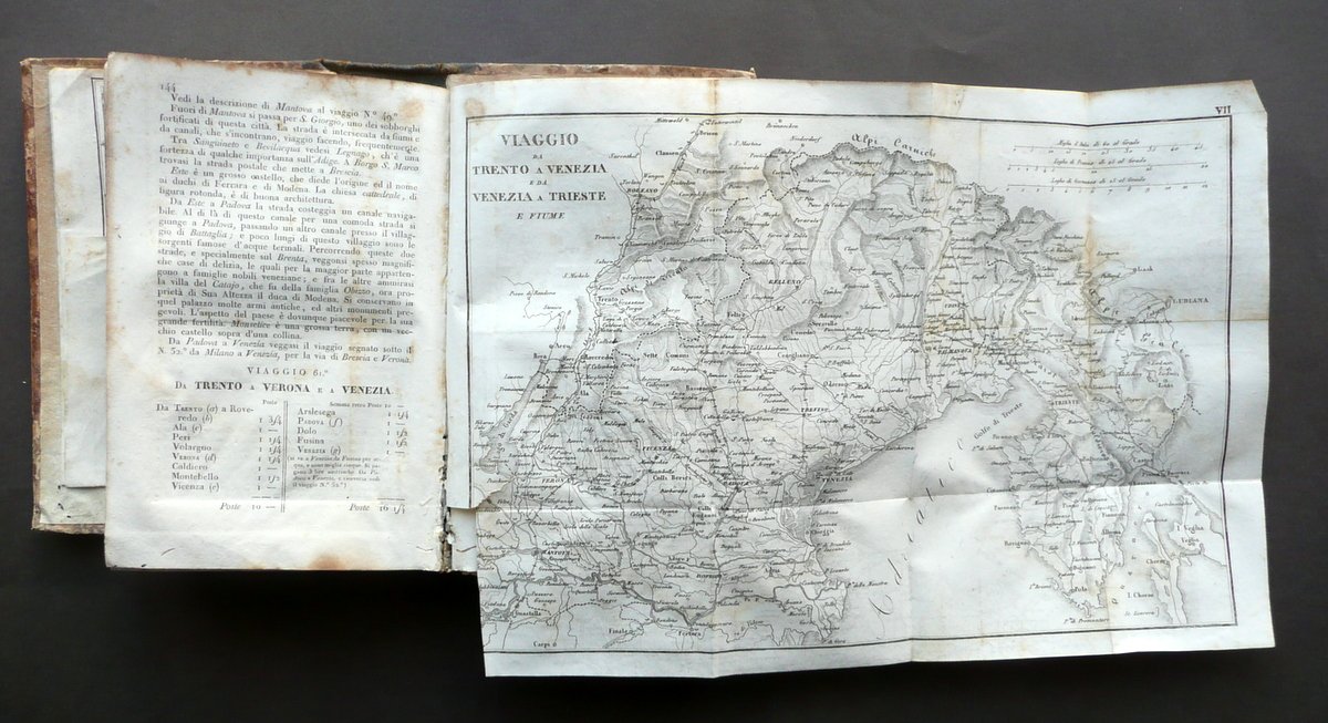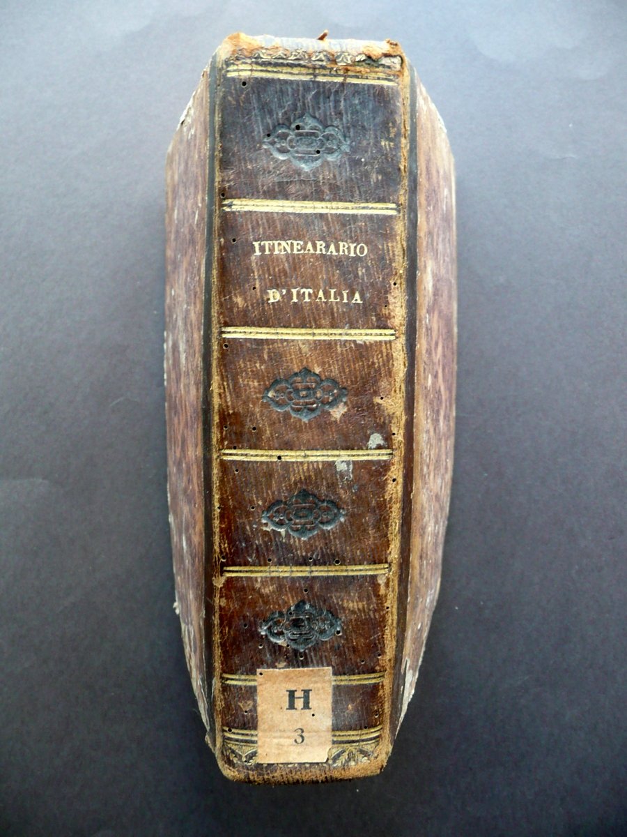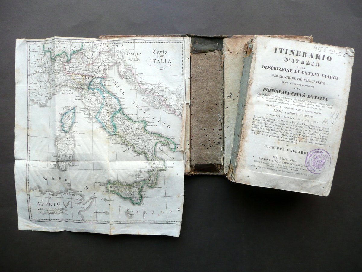 Giuseppe Vallardi, † Itinerario d'Italia o sia descrizione di CXXXVI [136] Viaggi per le strade pi˘ frequentate sÏ per posta che altrimenti alle Principali citt‡ d'Italia Coll'indicazione delle distanze, dei migliori alberghi, degli oggetti pi˘ interessanti di Belle Arti, Antiquarioa e Storia Naturale, delle principali produzioni e manifatture locali, ecc.†ecc. [.] Presso Pietro e Giuseppe Vallardi, Milano 1835, cm 18,5x12, pp. XCII; 370, con 11 carte in b/n rip. pi˘ volte fuori t. (presenti 11 carte sulle 15 totali); legatura d'epoca in mezza pelle con titolo e alcuni fregi impressi in oro e in nero al dorso, piatti in carta marmorizzata. Cuffia inf. con applicato vecchio pecetto di archiviazione. Frontespizio con vecchio timbretto e qualche leggera annotazione numerica a matita (vedi foto). † Condizioni di conservazione Esemplare in discrete condizioni con tracce d'uso e leggeri segni del tempo; coperta con alcune piccole leggere abrasioni e qualche circoscritta mancanza; dorso con alcuni minimi forellini (danni da tarlo) che coinvolgono in misura minima e marginale i margini interni di alcune pagine, senza mai compromettere la lettura del testo. Interni complessivamente ben conservati, staccati dalla legatura e con lieve allentamento delle cuciture / distacco di qualche fascicolo e carta; alcune piccole leggere bruniture e qualche lieve ombra di gora, le quali non compromettono la lettura del testo; mancanza di quattro carte fuori testo (ne sono presenti 11 su 15). † Bella e dettagliata opera di viaggi, con numerose indicazioni anche delle varie stazioni di posta (vedi foto). Condizioni come da foto e da descrizione, legate all'uso e alla ripetuta consultazione durante i viaggi, nonchÈ alla prolungata esposizione sia ai fattori atmosferici che alle condizioni di trasporto. † SETT111.L10681 N